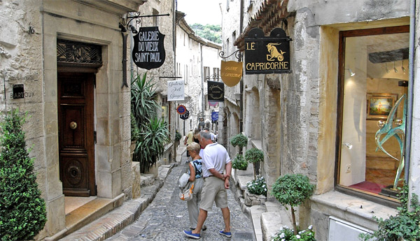 Kylän muurien kupeessa on legendaarinen ravintolahotelli La Colombe d’Or. 1920-luvun taiteilijat nauttivat Titine-emännän herkullisista ruoka-annoksista ja jättivät ravintolaan maksuksi taideteoksiaan – ravintola omistaakin nykyään ensiluokkaisen 1900-luvun taiteen yksityiskokoelman. Ruokasalissa on mm Mirón, Picasson, Matissen ja Braquen töitä. Puutarhan muurissa on mm. valtaisa värikäs Légerin mosaiikkityö. Colombe d’Or muistetaan myös mm. Yves Montandin ja Simone Signoret’n häävastaanotosta. Sitä vastapäätä on tyypillistäkin tyypillisempi ranskalainen brasserie, Café de la Place, jossa on kuvattu useita kohtauksia Provence-aiheisissa elokuvissa.