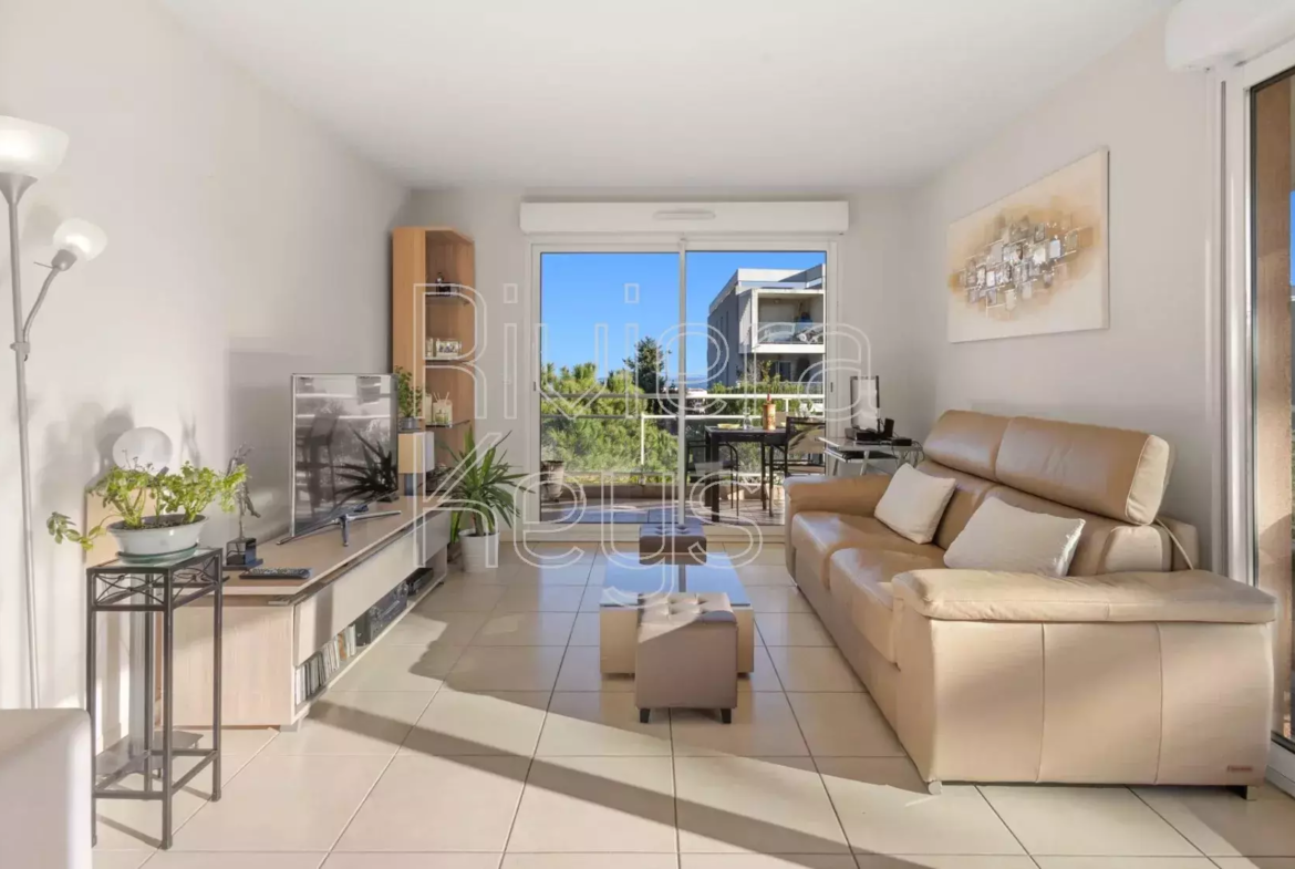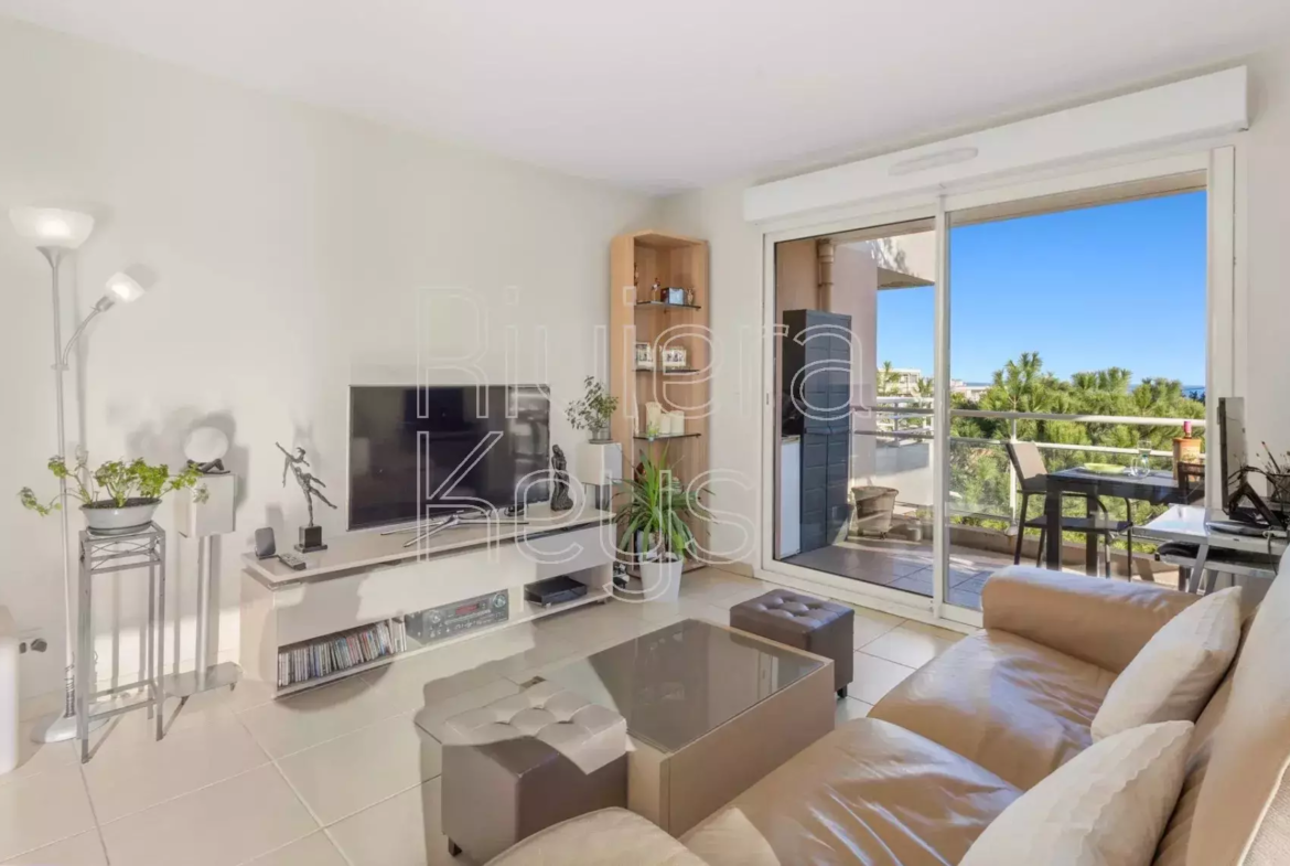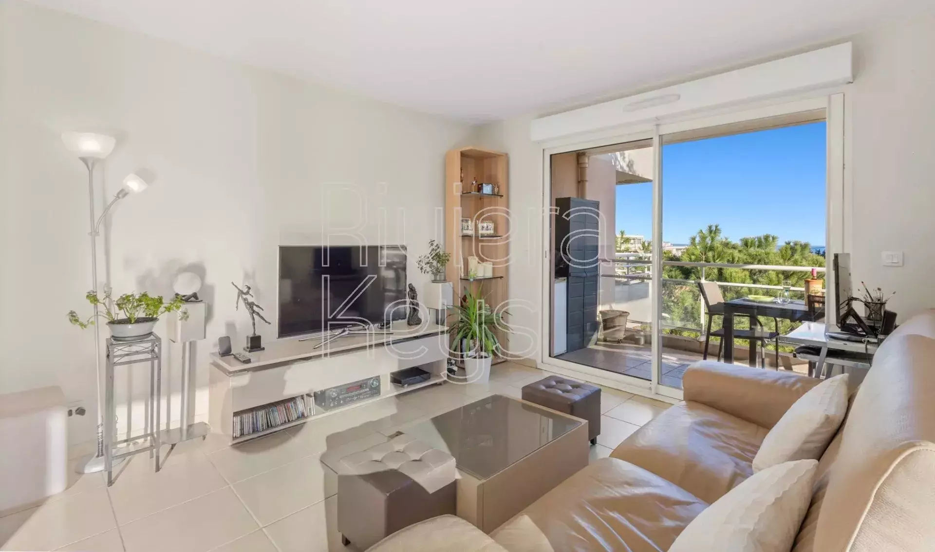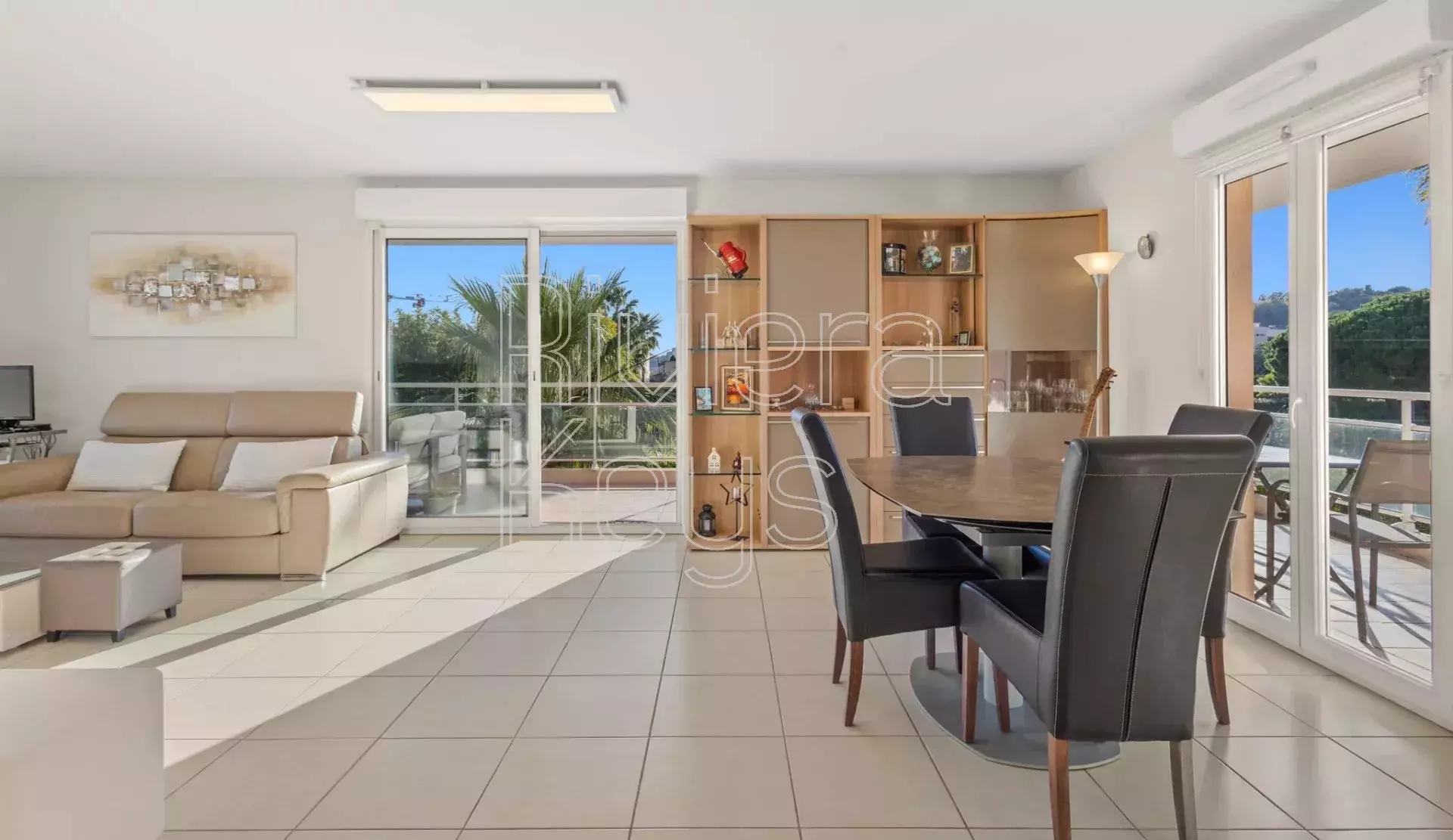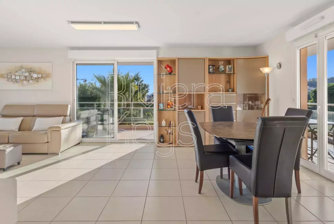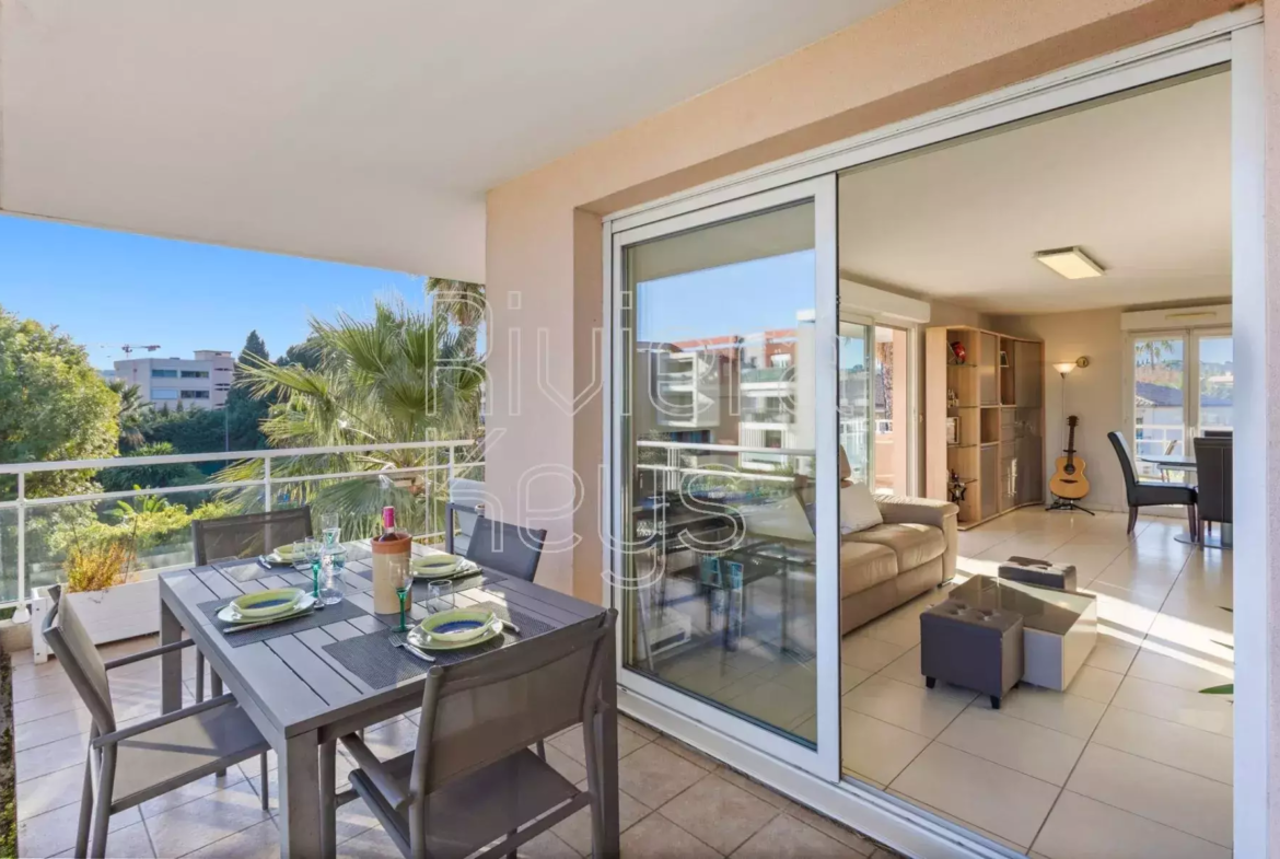 Antibesin rauhallisella esikaupunkialueella sijaitseva, korkean kerroksen läpitalon asunto, jolla on aurinkoinen kulmaterassi.