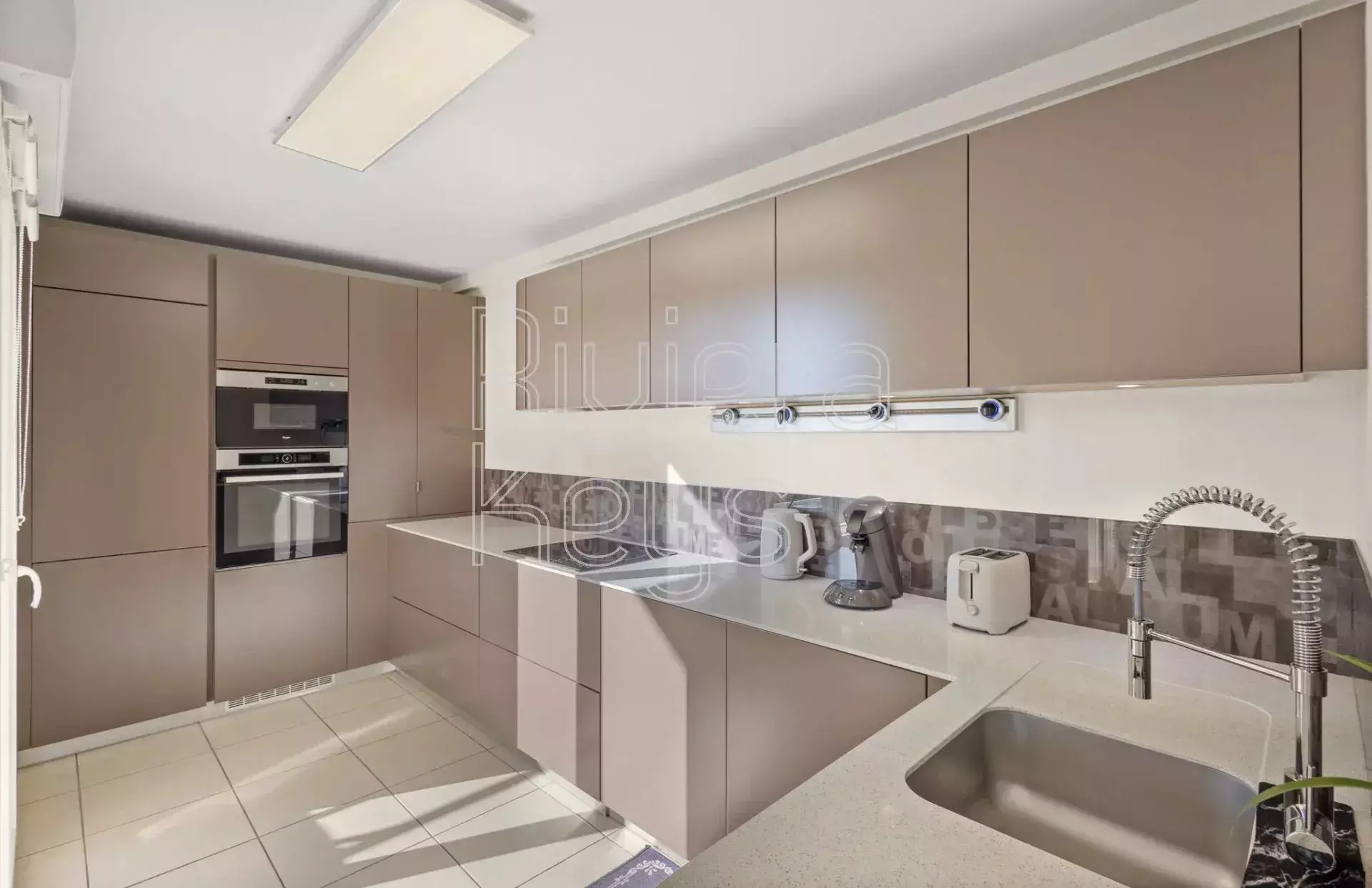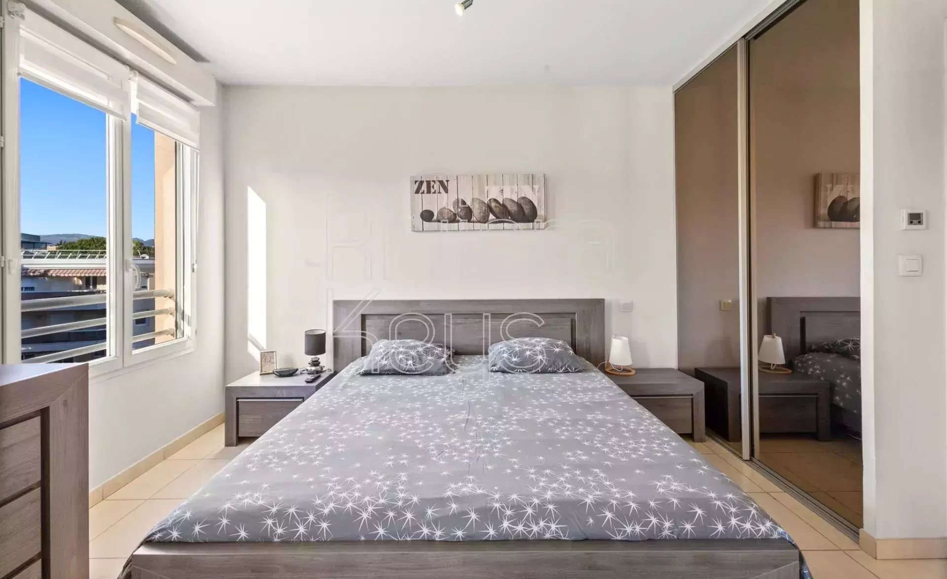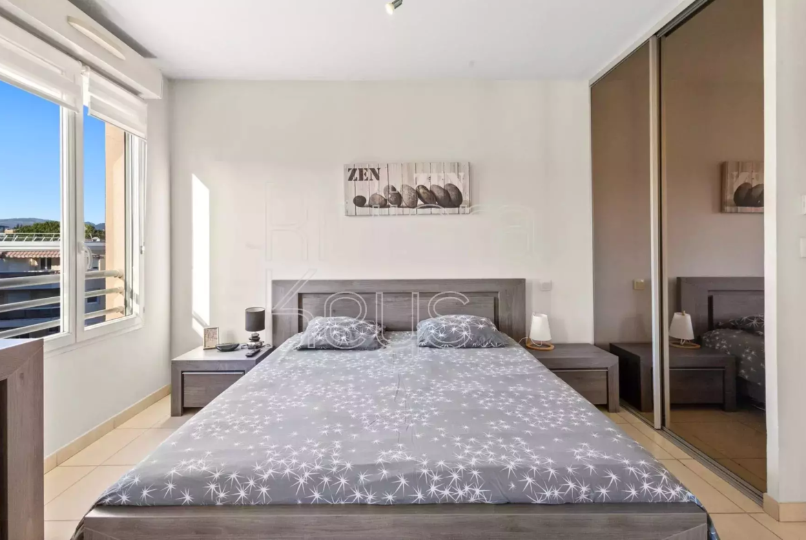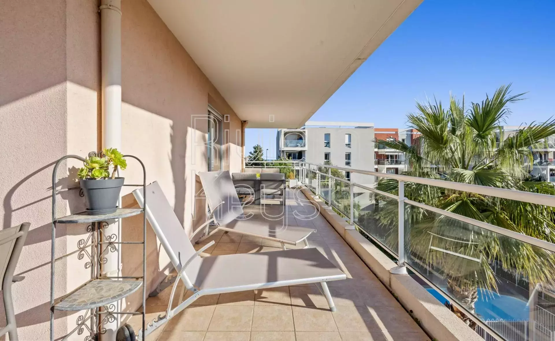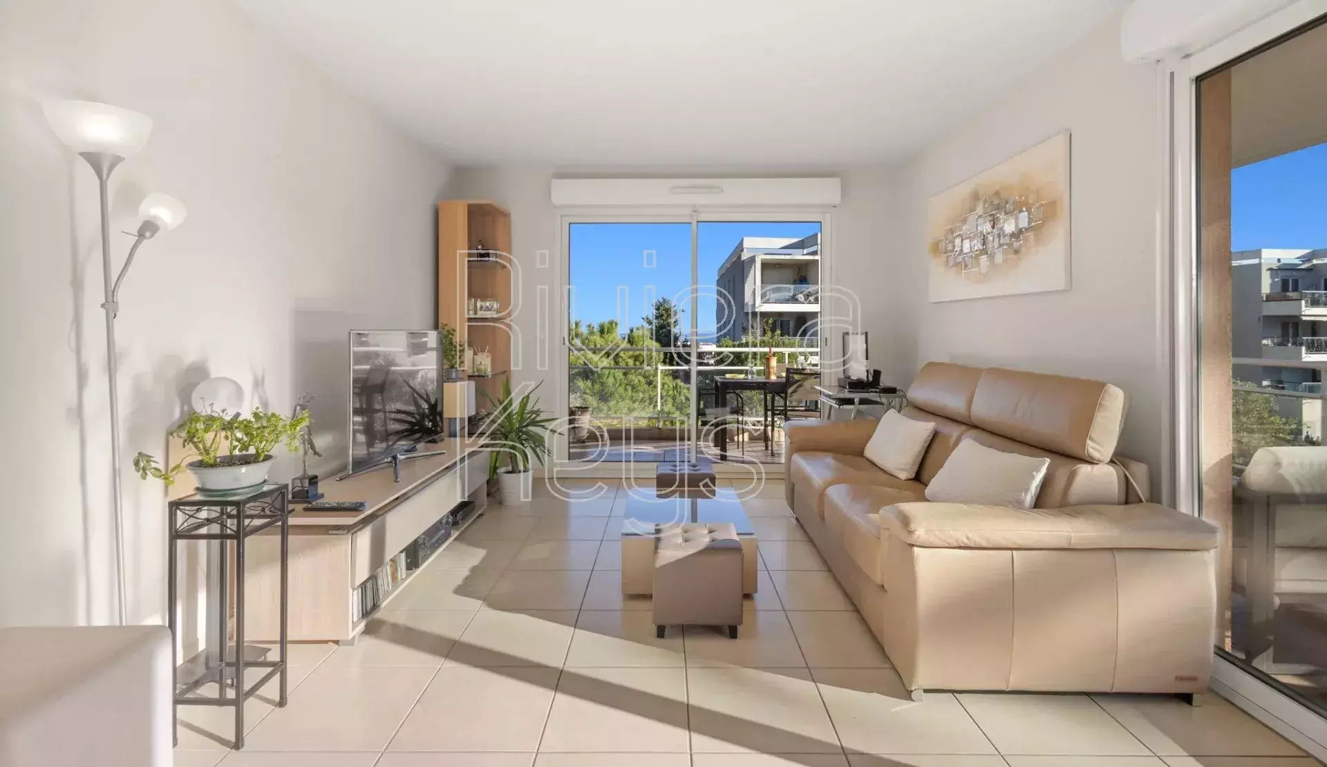 Antibesin rauhallisella esikaupunkialueella sijaitseva, korkean kerroksen läpitalon asunto, jolla on aurinkoinen kulmaterassi.