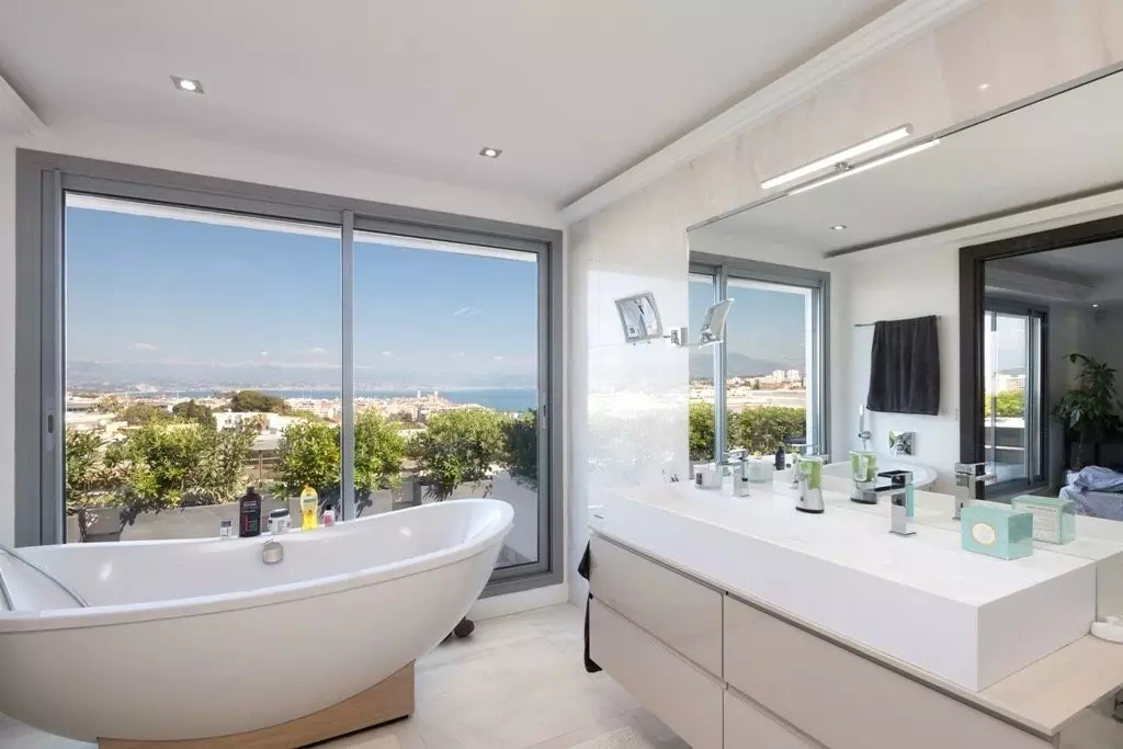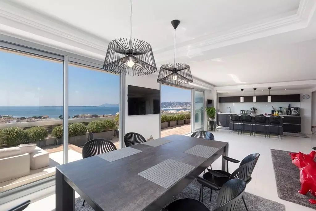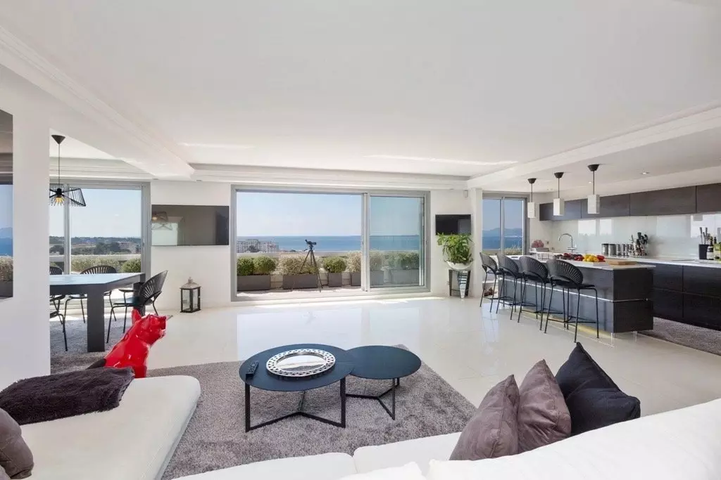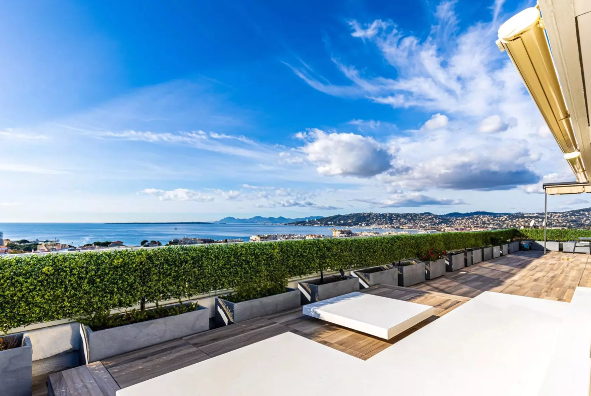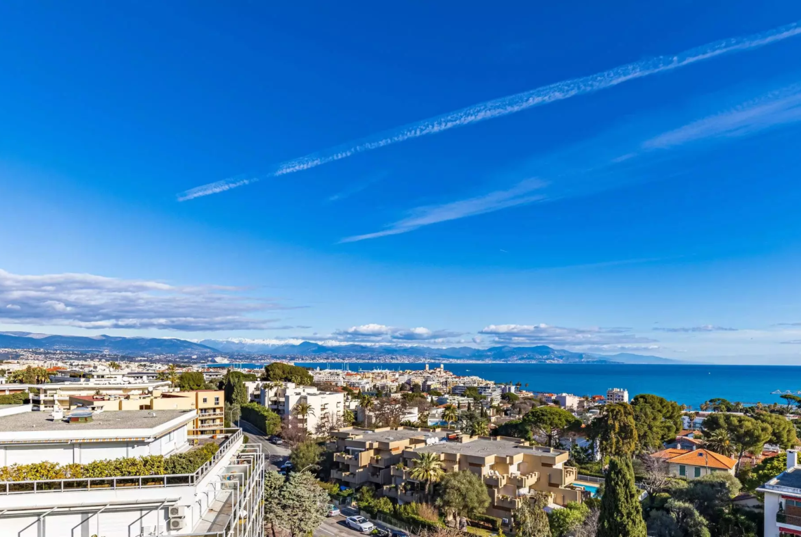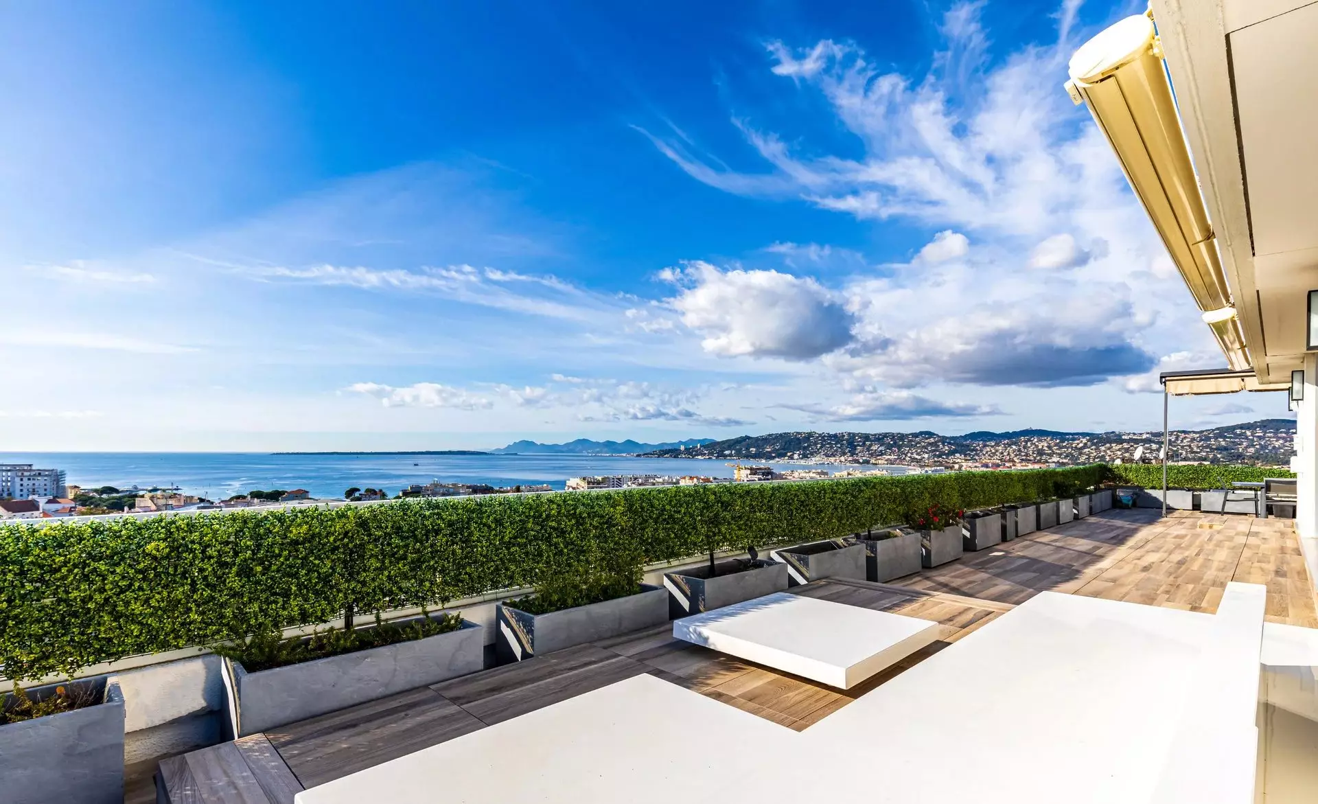 Antibesin Rostagnen arvostetulla alueella, Antibesin ja Juan-les-Pins’n välillä sijaitseva kattohuoneisto, jolla valtava terassi ja panoraamanäkymät merelle.
