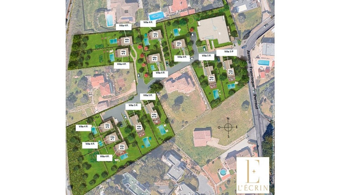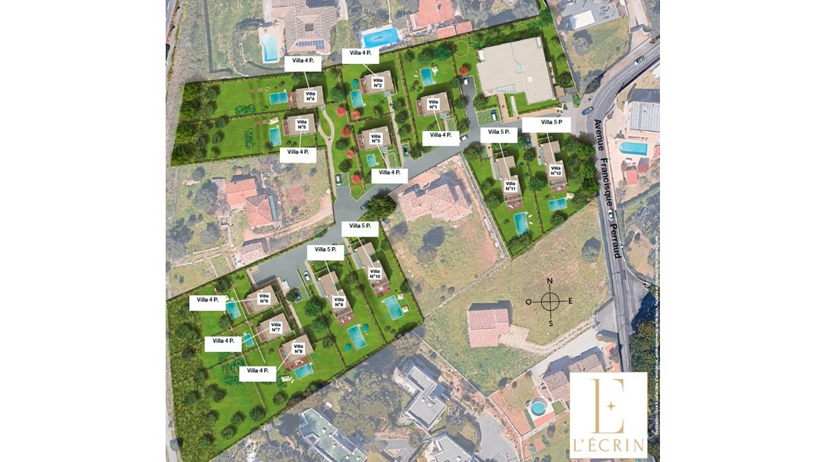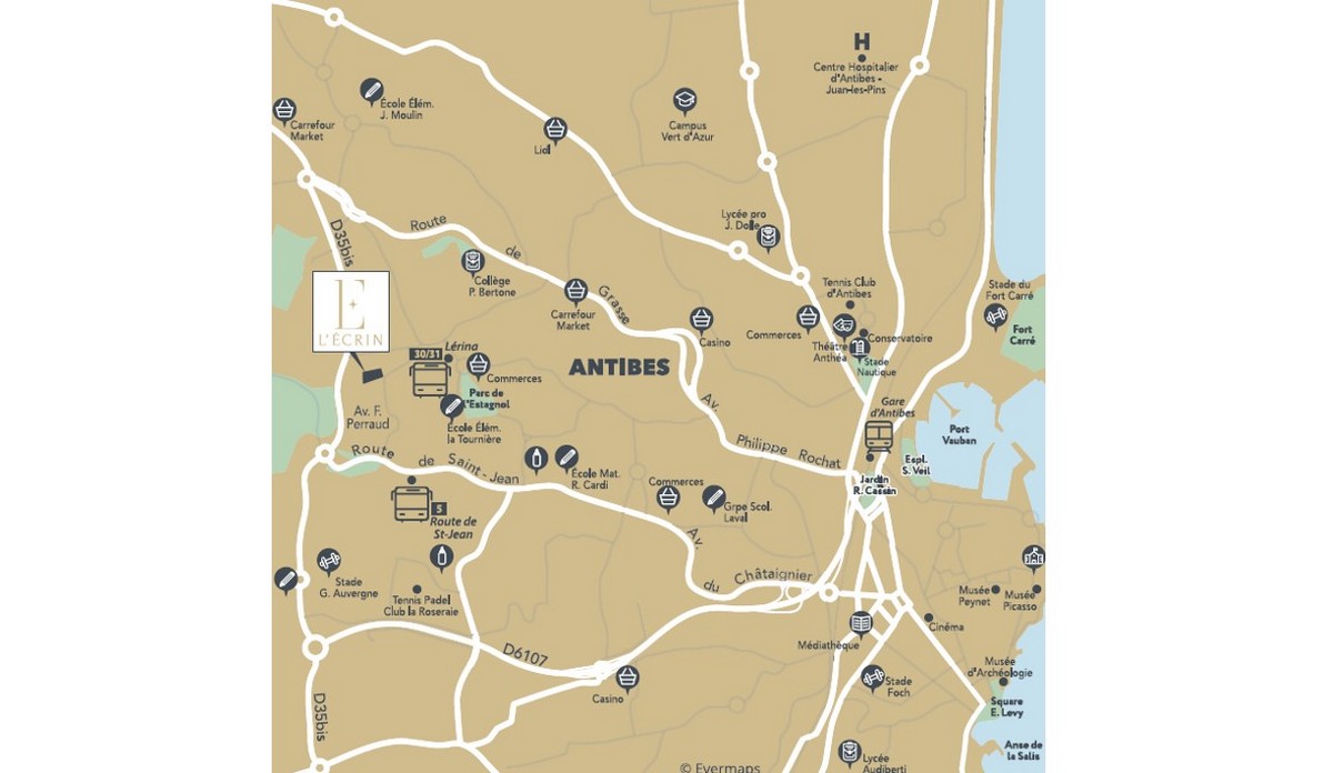 L’Ecrin tulee olemaan viehättävä, suljettu domaine Antibesin halutulla Estagnolin alueella kauniiden näkymien äärellä. Täältä on matkaa lähirannalle vajaa 3 km, Antibesin ydinkeskustaan n. 3 km ja Juan-les-Pins’n keskustaan vajaa 4 km. Leipäkauppa, ruokakauppa ja apteekki sijaitsevat alle 10 minuutin kävelymatkan päässä. Isoille kaupoille on matkaa n. 2 km. Sophia-Antipolis-teknologiapuiston yritykset ovat helposti saavutettavissa täältä käsin. Nizzan lentokentälle on matkaa vajaa 20 km.