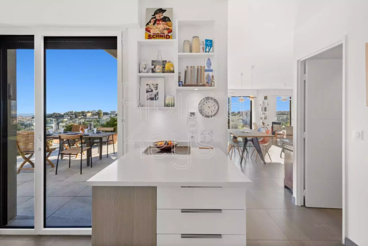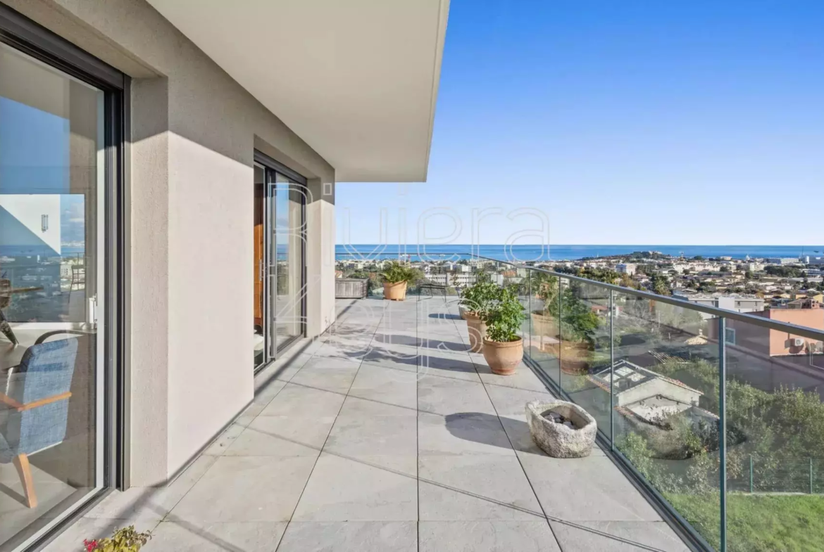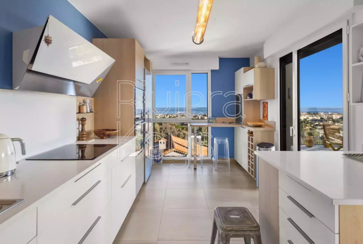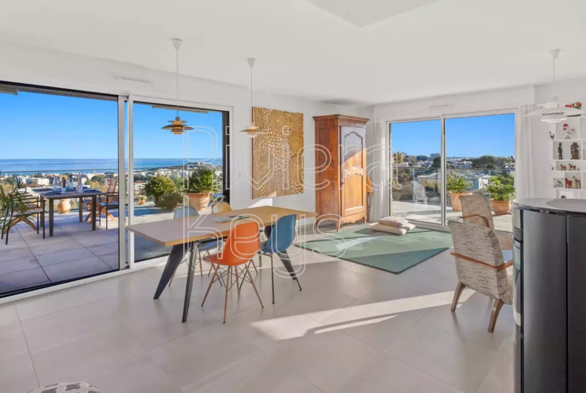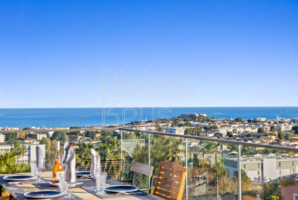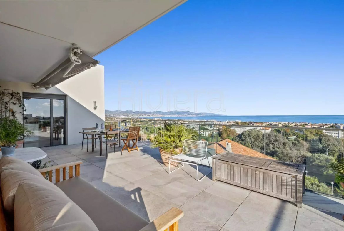 Antibesin Rastinen arvostetulla alueella, ylimmän kerroksen kulmahuoneisto upealla terassilla ja panoraamanäkymin.