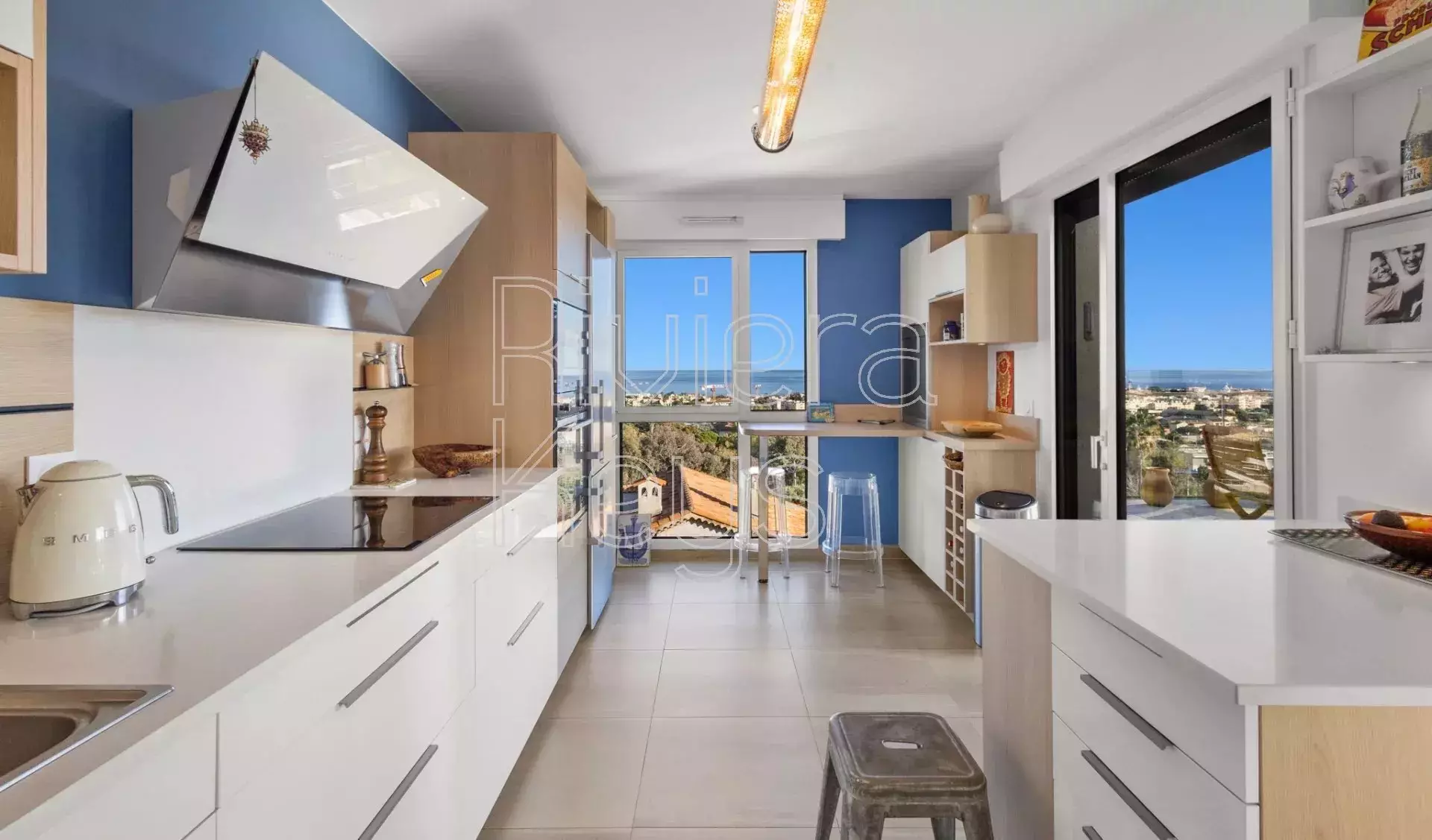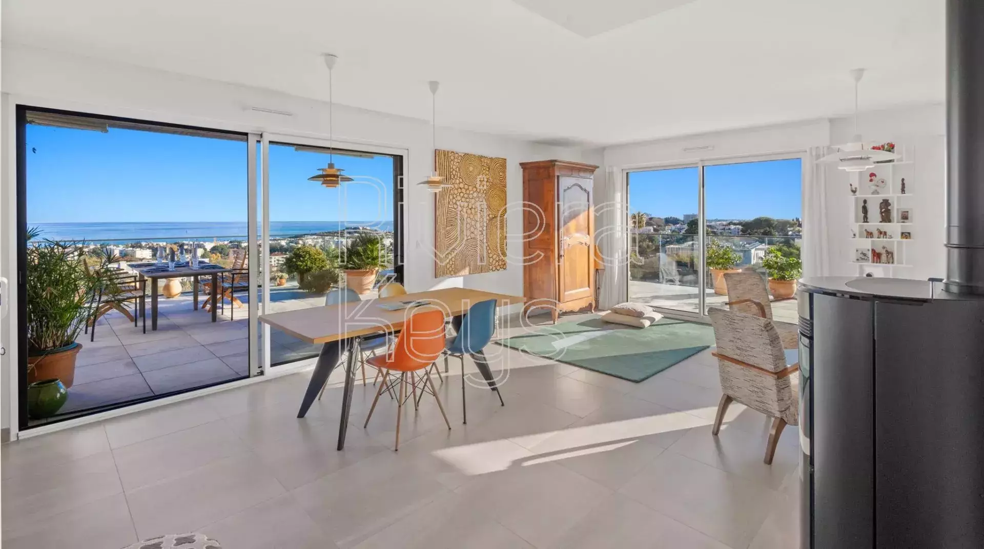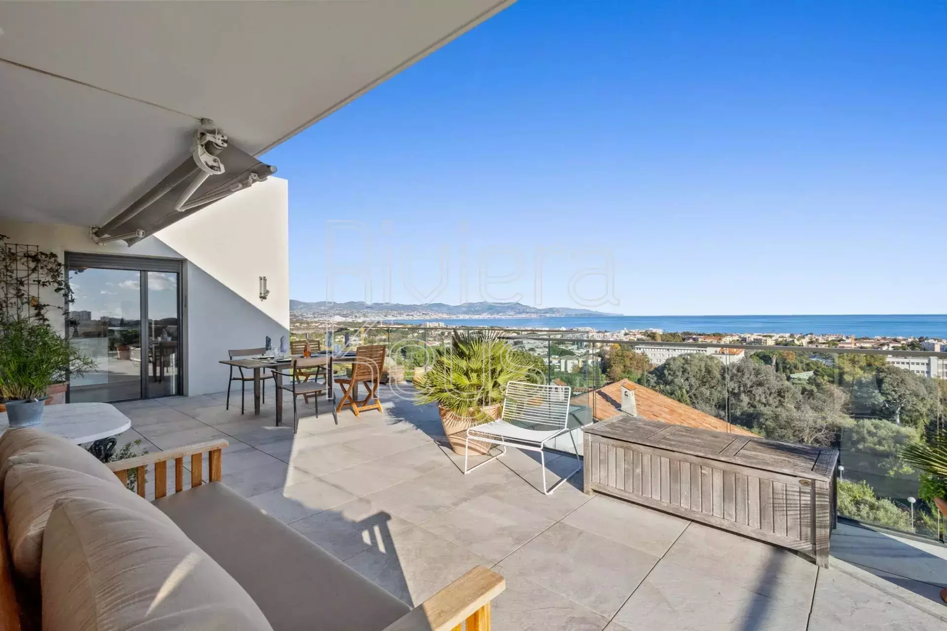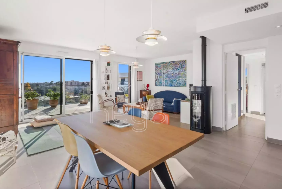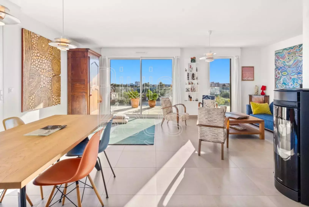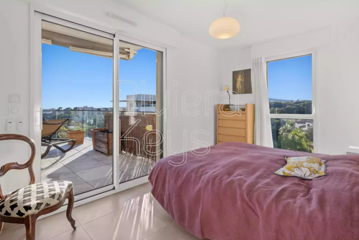 Antibesin Rastinen arvostetulla alueella, ylimmän kerroksen kulmahuoneisto upealla terassilla ja panoraamanäkymin.