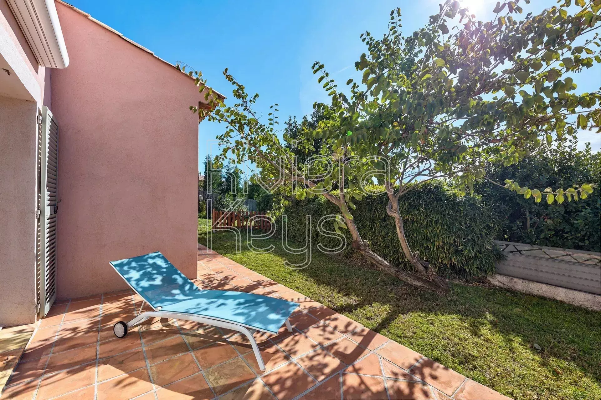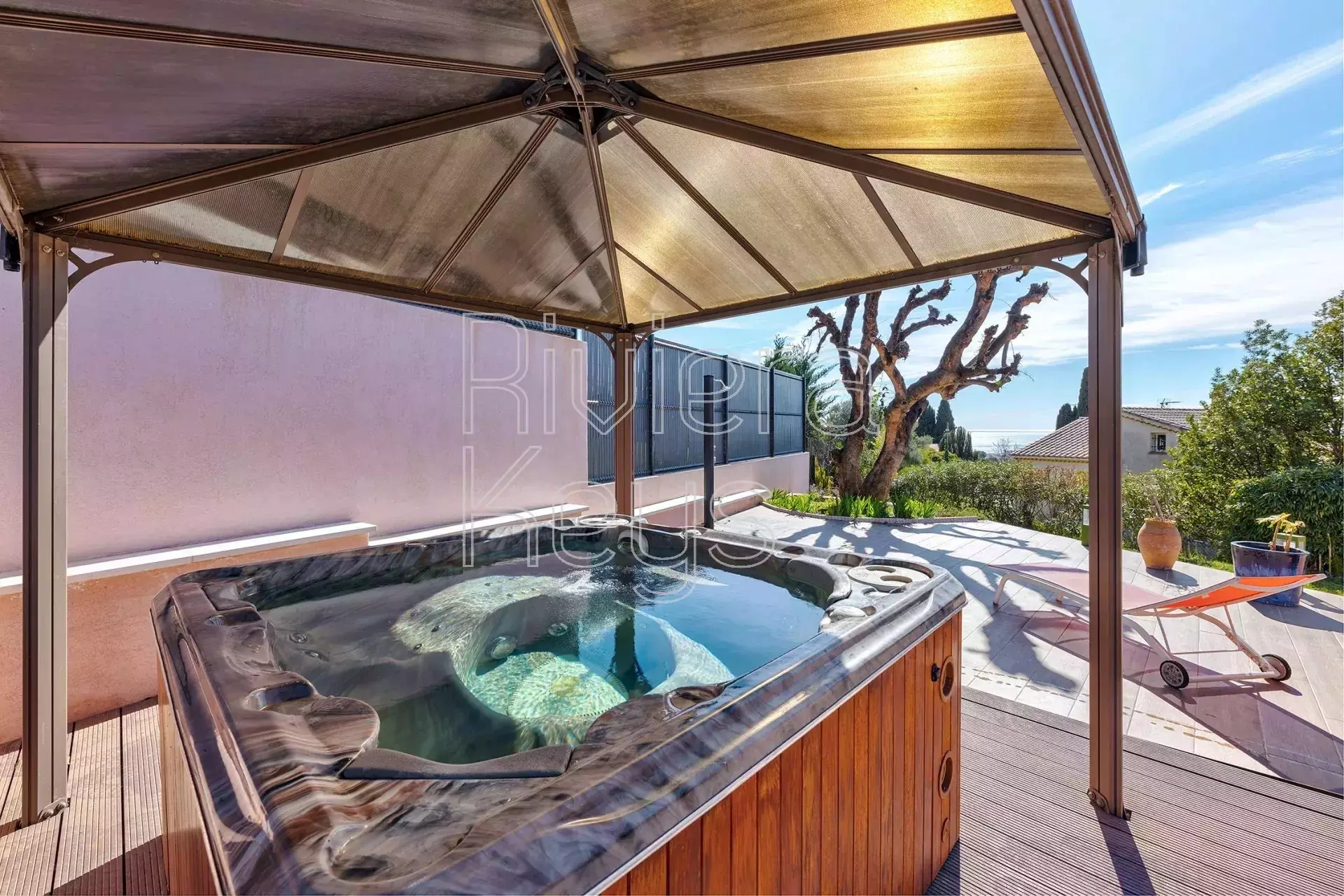 Tontilla on terasseja, puutarhaa ja poreallas.