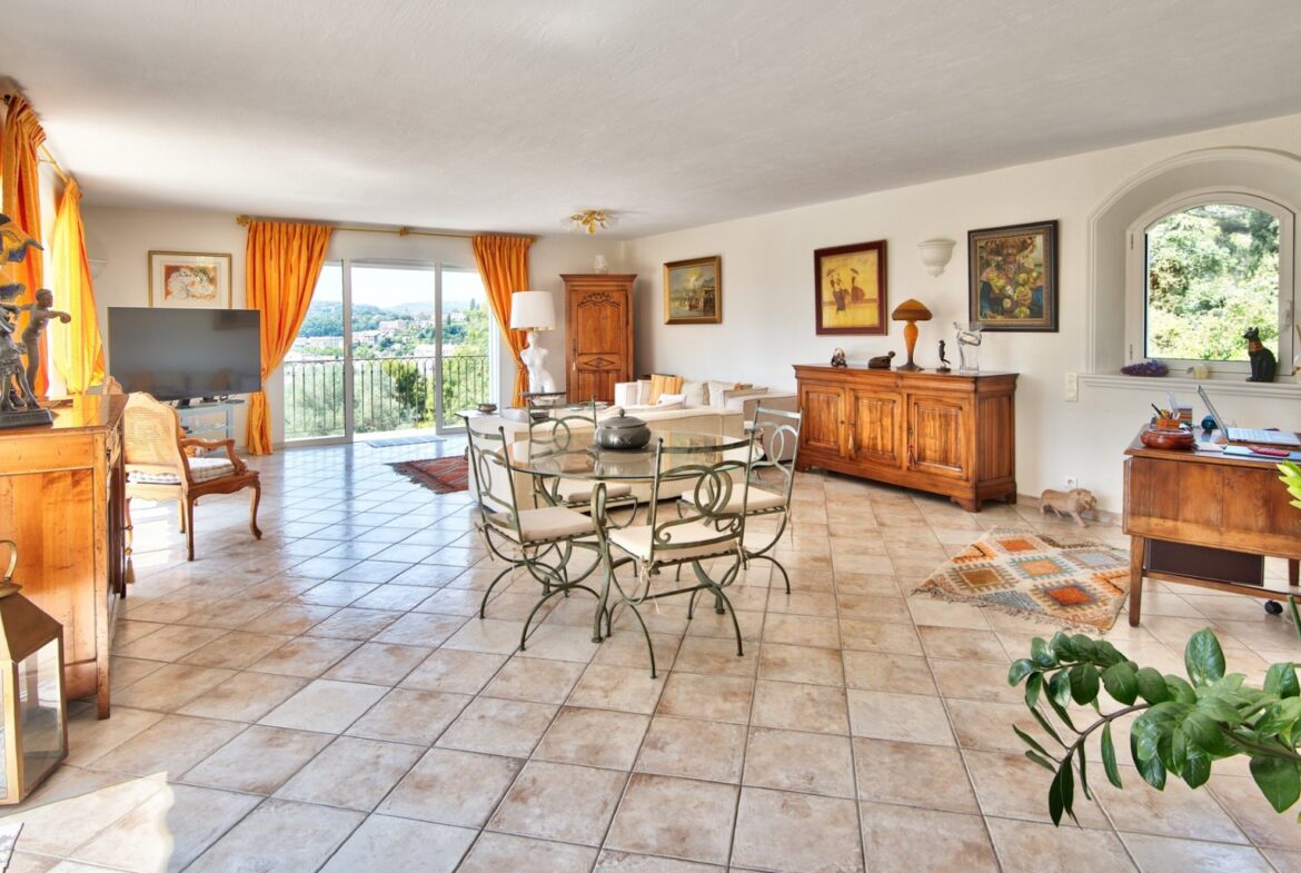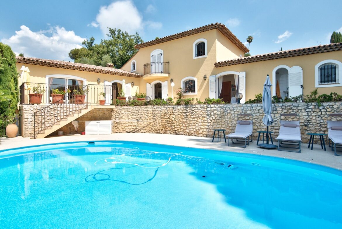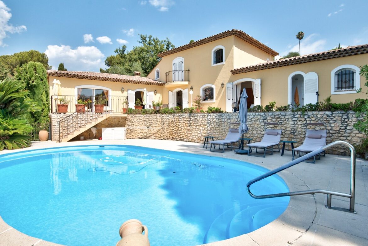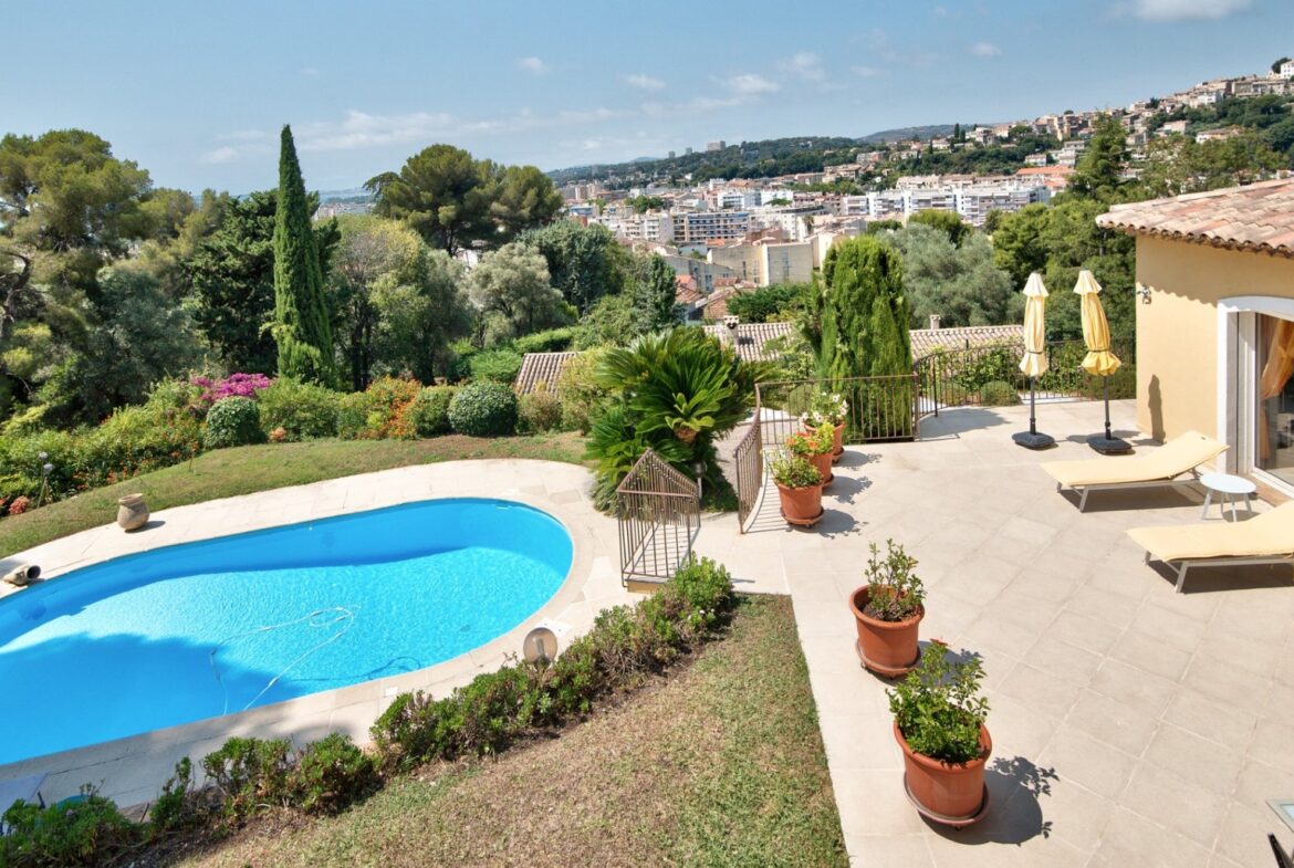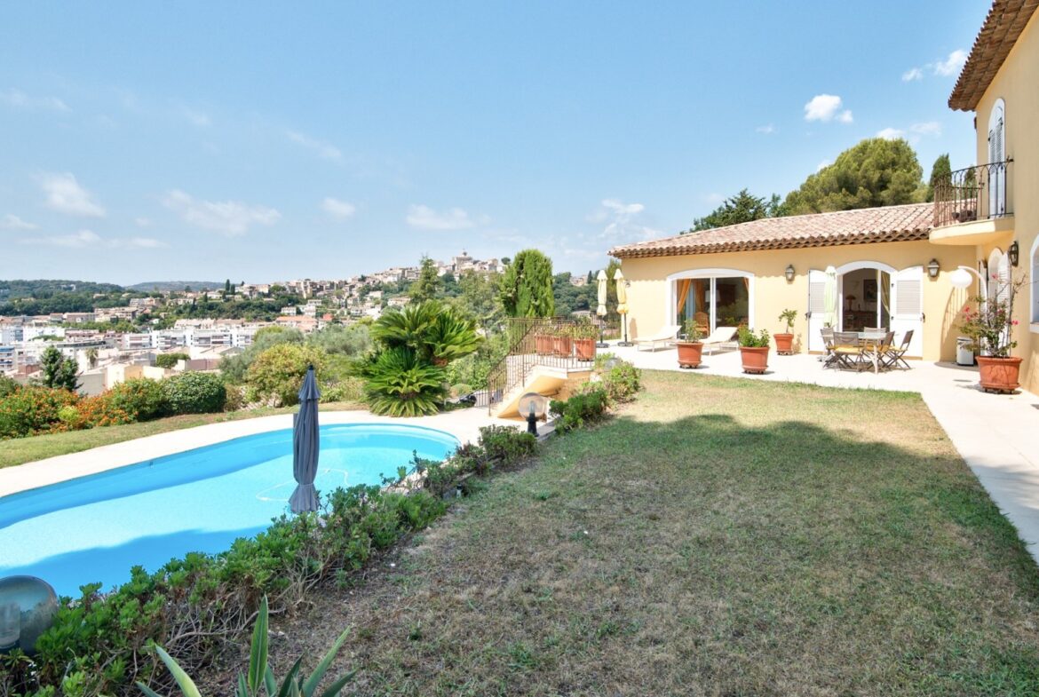 Cagnes-sur-Merissä, rauhallisella ja halutulla paikalla sijaitseva talo, jolla on uima-allas ja avoimet näkymät ympäröiville kukkuloille, merelle ja vanhan kaupungin linnalle.
