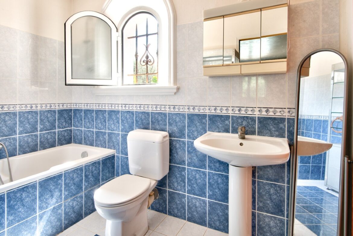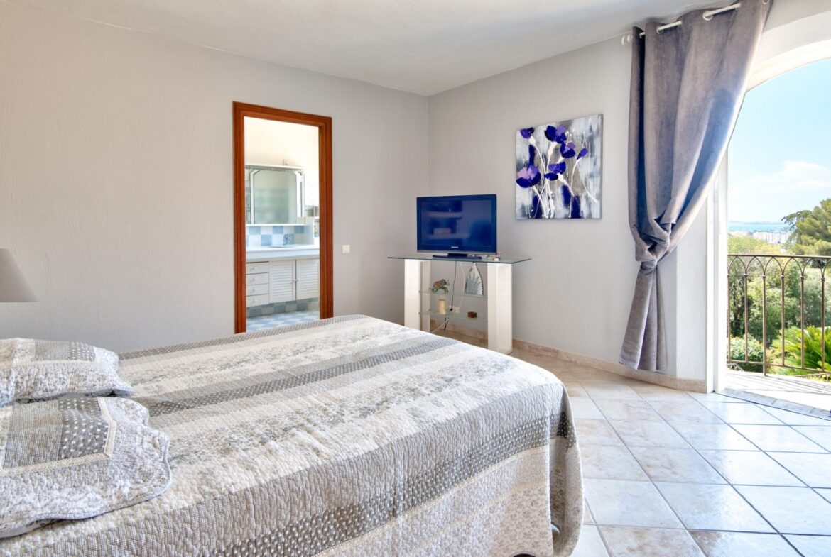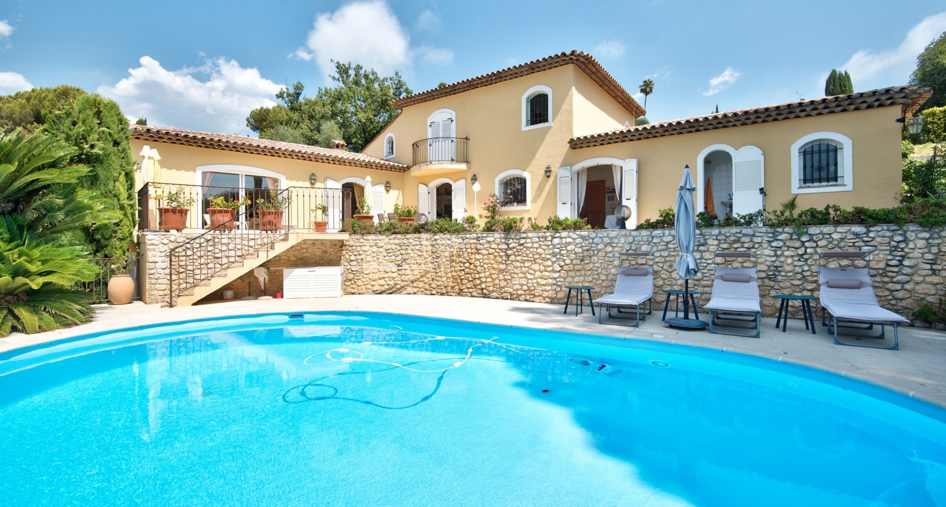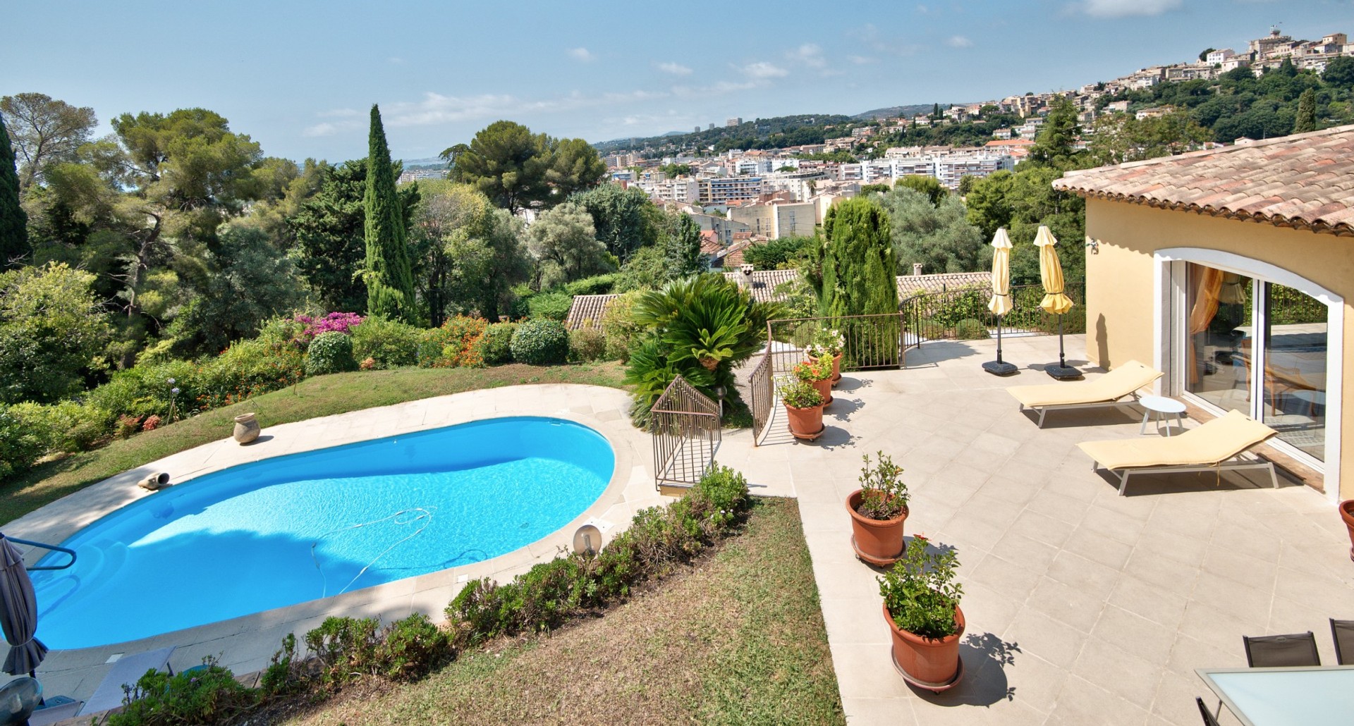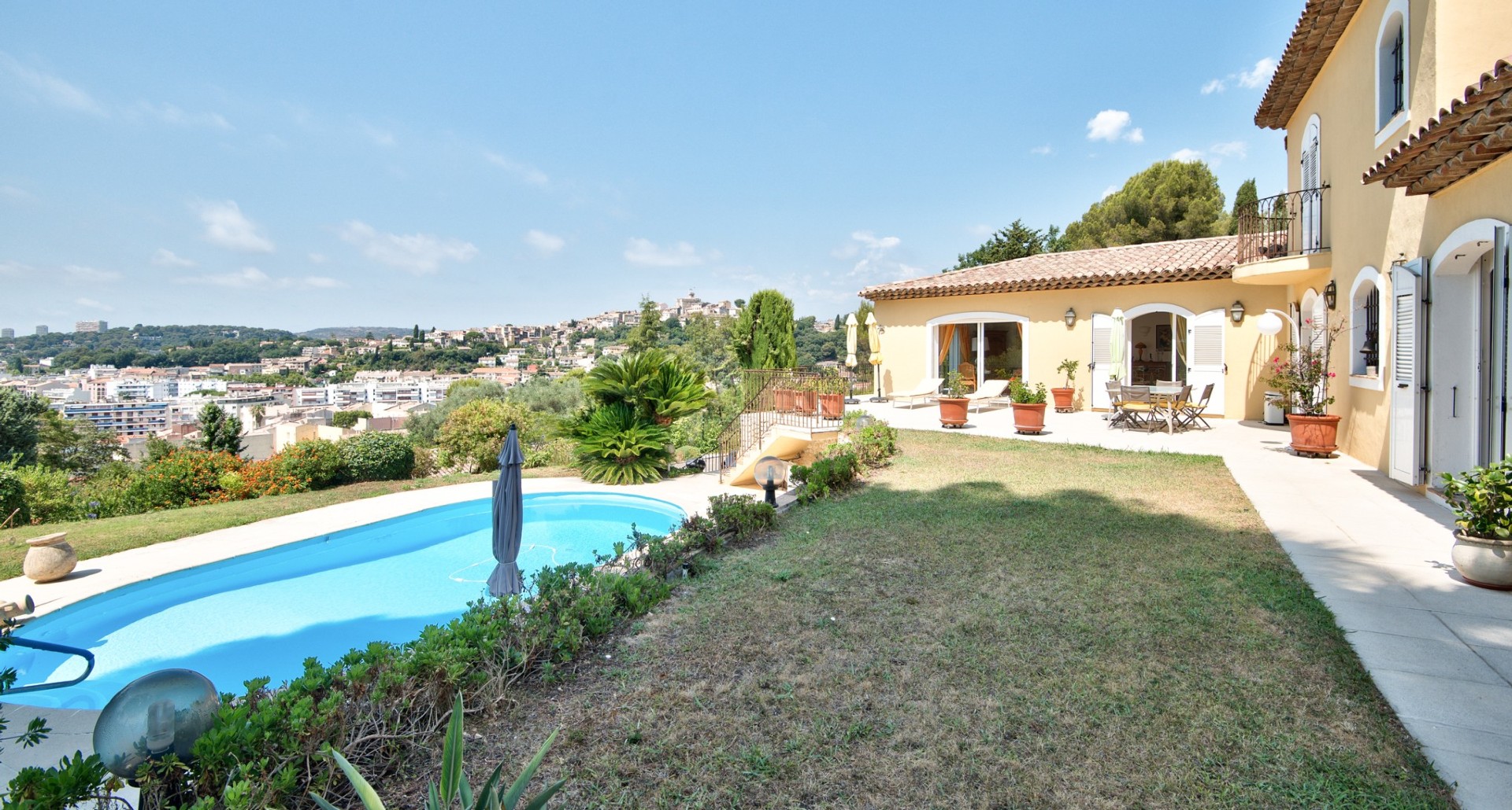 Cagnes-sur-Merissä, rauhallisella ja halutulla paikalla sijaitseva talo, jolla on uima-allas ja avoimet näkymät ympäröiville kukkuloille, merelle ja vanhan kaupungin linnalle.