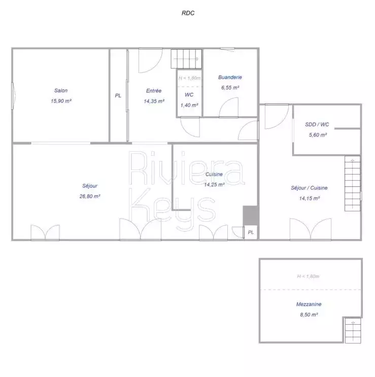 Yläkerrassa on viisi makuuhuonetta, jotka jakavat erillisen WC:n ja kylpyhuoneen. Päämakuuhuoneessa on parveke merinäköalalla.