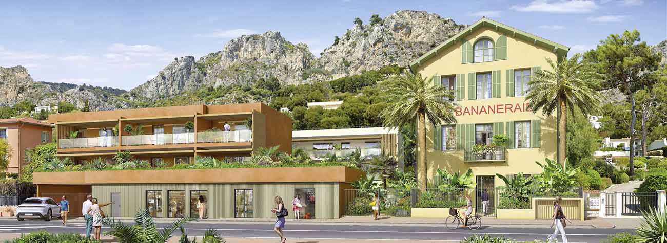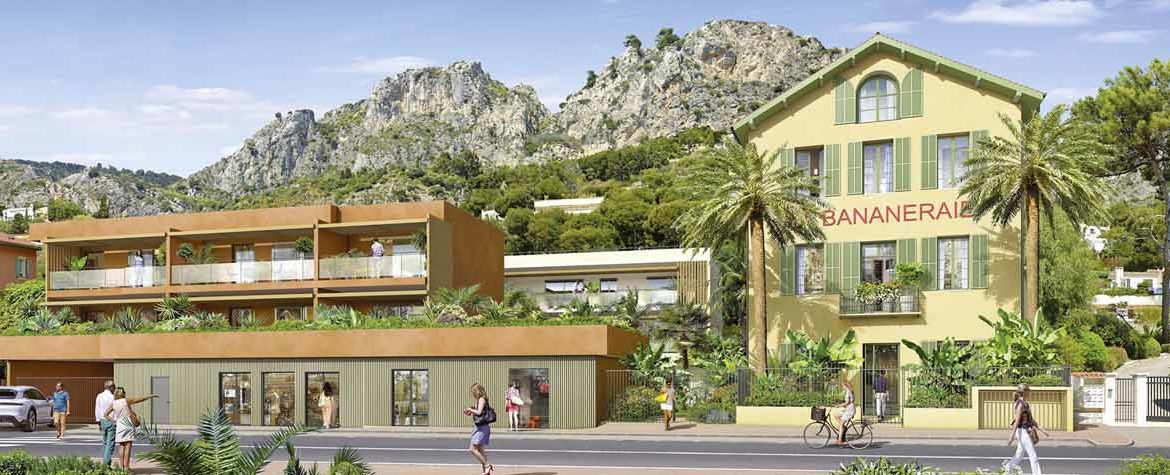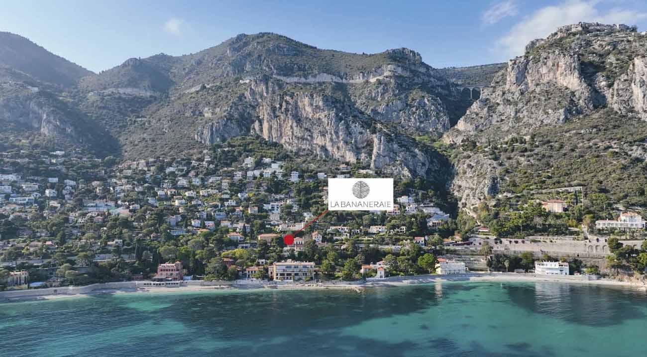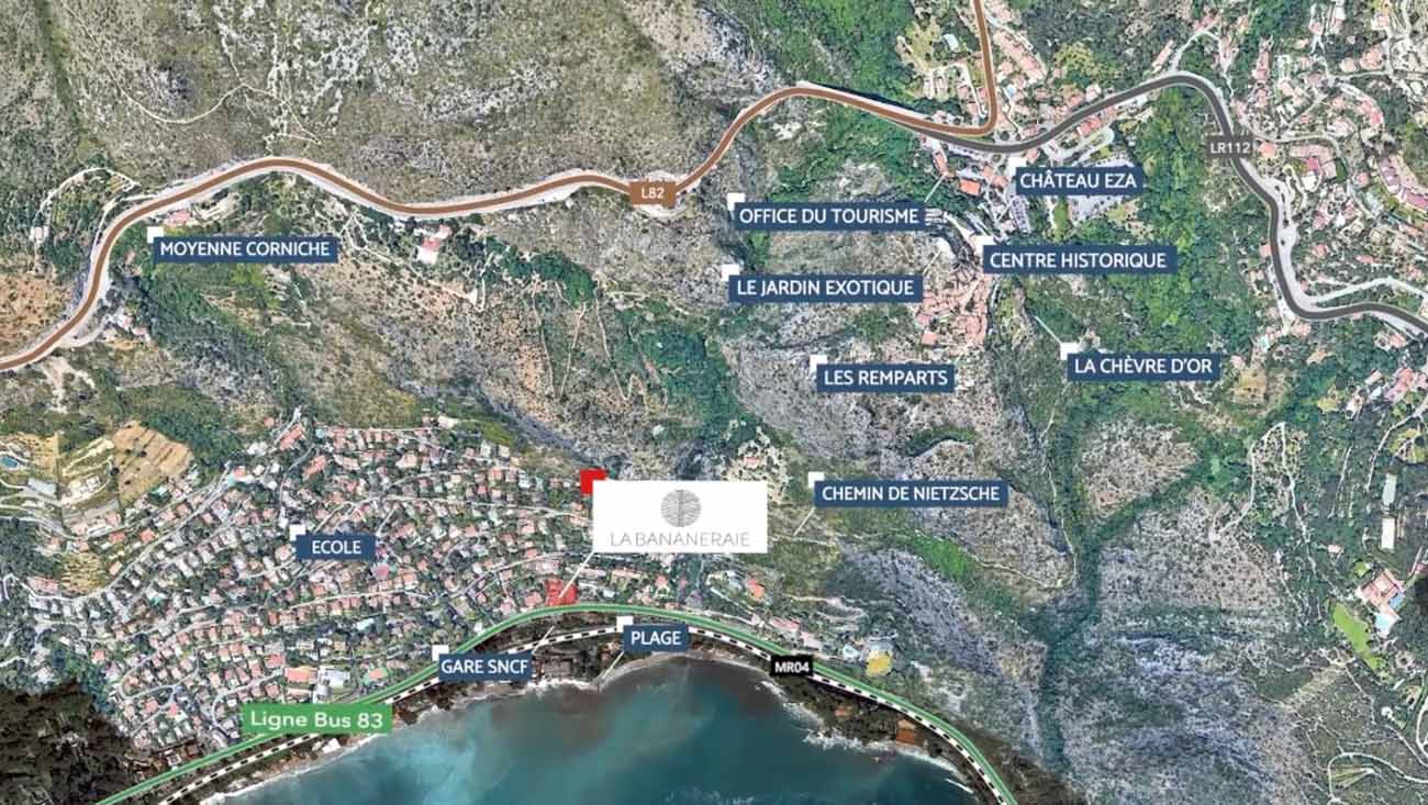 Bananeraie on rakenteilla harvinaiselle paikalle, uimarannan tuntumaan, rantakadun varrelle, pieneen ja ihastuttavaan Ezen kylään, Nizzan ja Monacon välille. Turkoosi Välimeri ja jylhät Meri-Alpit tekevät paikasta paratiisin. Ezen keskiaikainen vanha kaupunki kurkottaa vuorenjyrkänteellä, jonne johtaa rannalta mm. Nietzschen patikkareitti. Ezen vanha kaupunki on yksi seudun kauneimmista panoraamanäkymineen, eksoottisine puutarhoineen, käsityöläisputiikkeineen ja herkkuravintoloineen. Bananeraien edessä on Ezen rautatieasema, josta pääsee junalla 7 minuutissa Monacoon tai 14 minuutissa Nizzan keskustaan. Myös bussit kulkevat kaunista rantareittiä vaikkapa Beaulieu-sur-Merin tai Cap d’Ail palveluiden pariin. Bananeraielta on 3 minuutin kävelymatka uimarannalle ja lähipalveluihin.