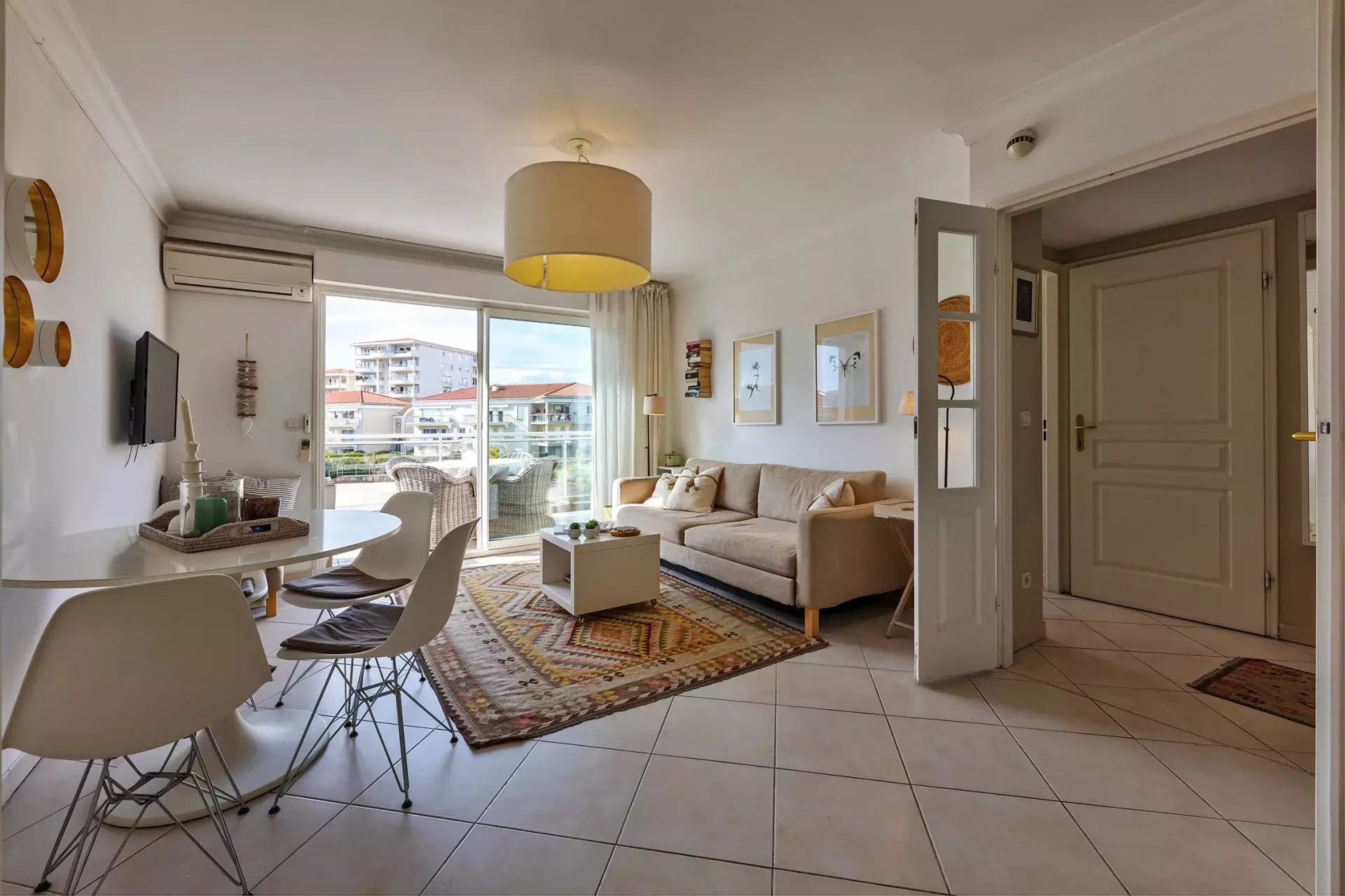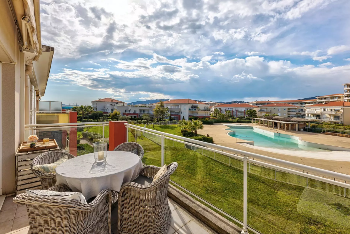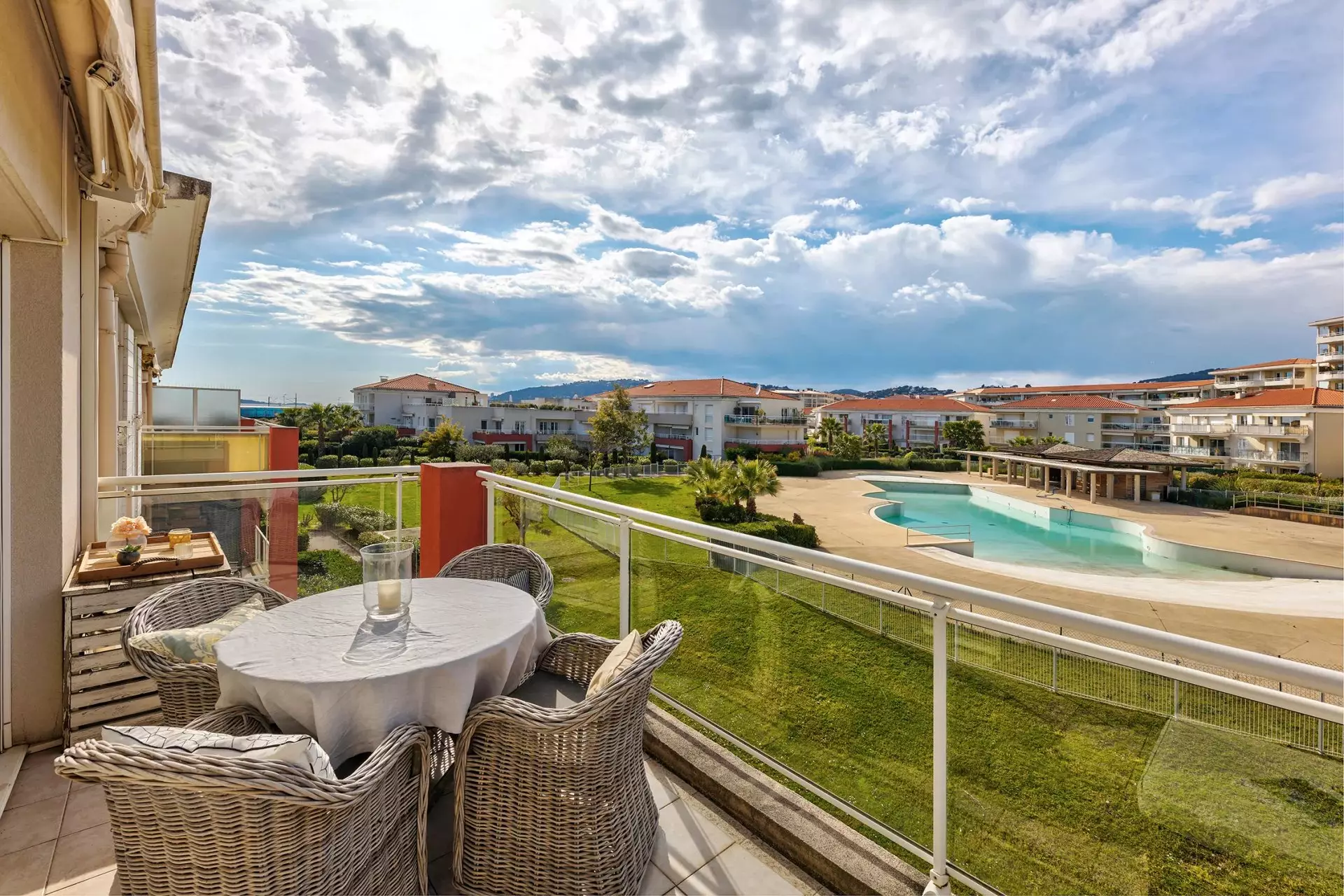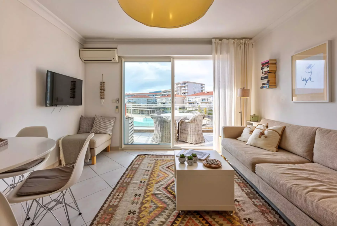Juan-les-Pins’ssä, kivenheiton matkan päässä hiekkarannasta sijaitseva asunto, jonka terassilta näkymä uima-altaalle.