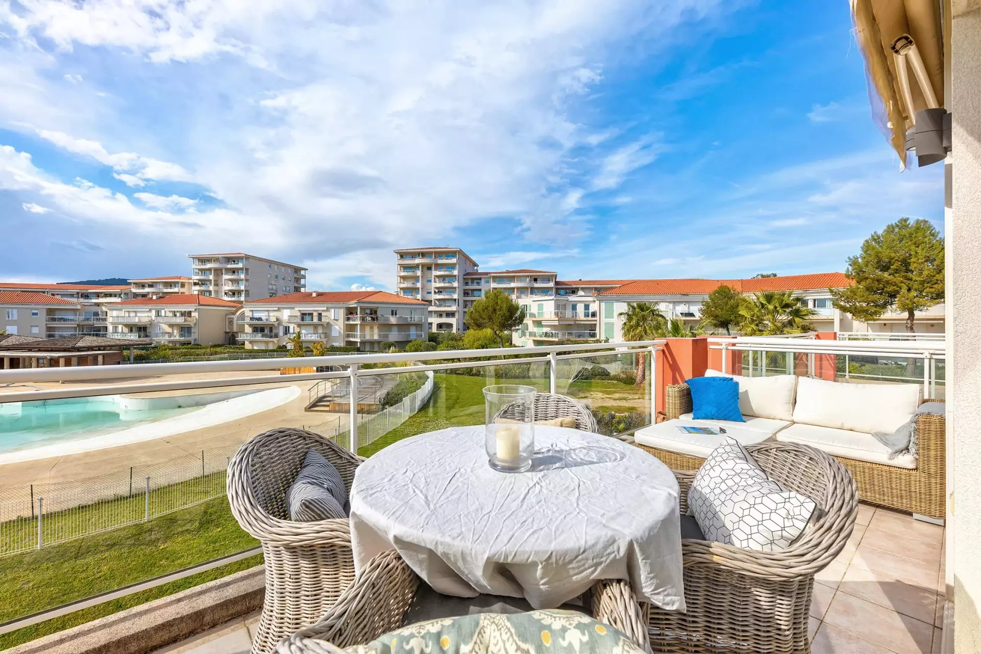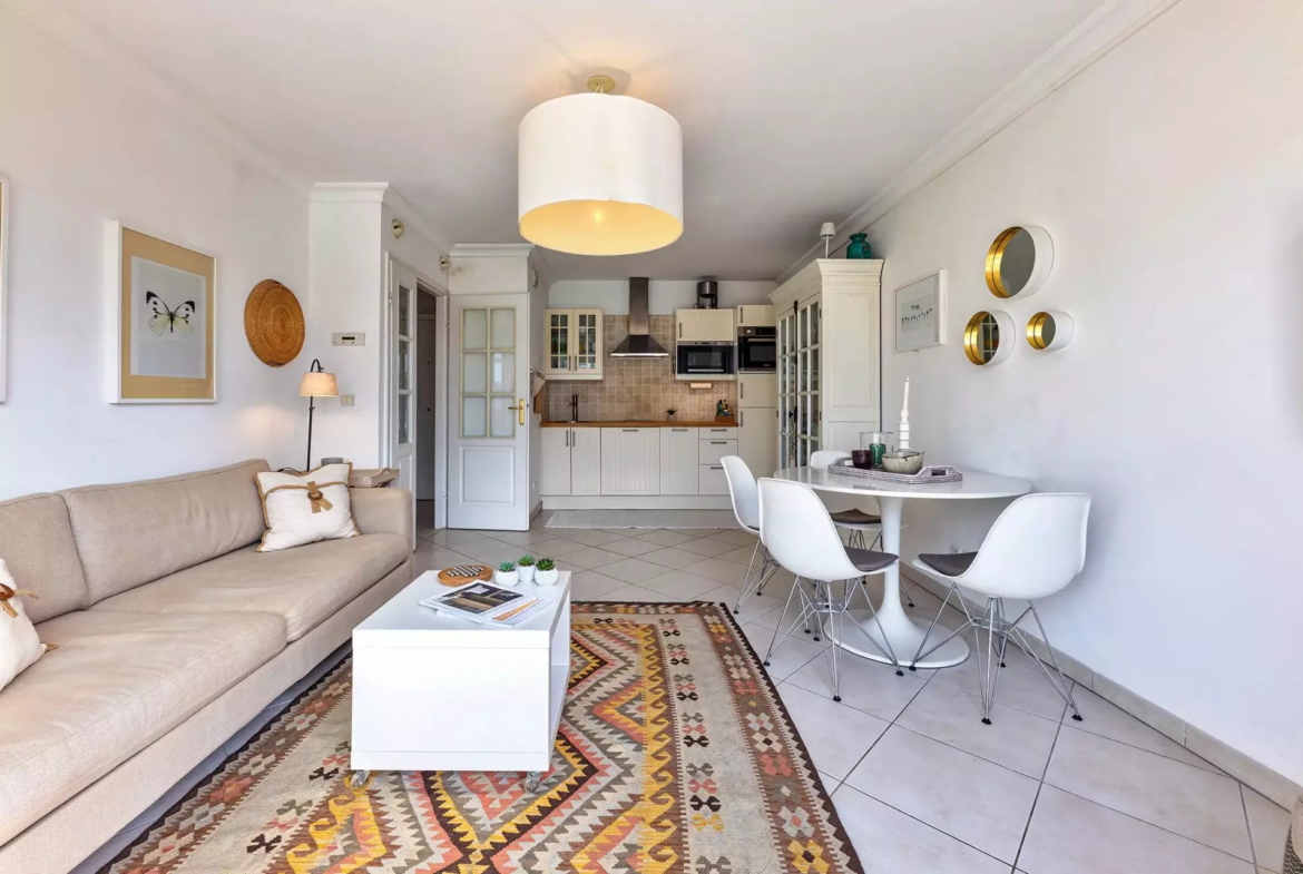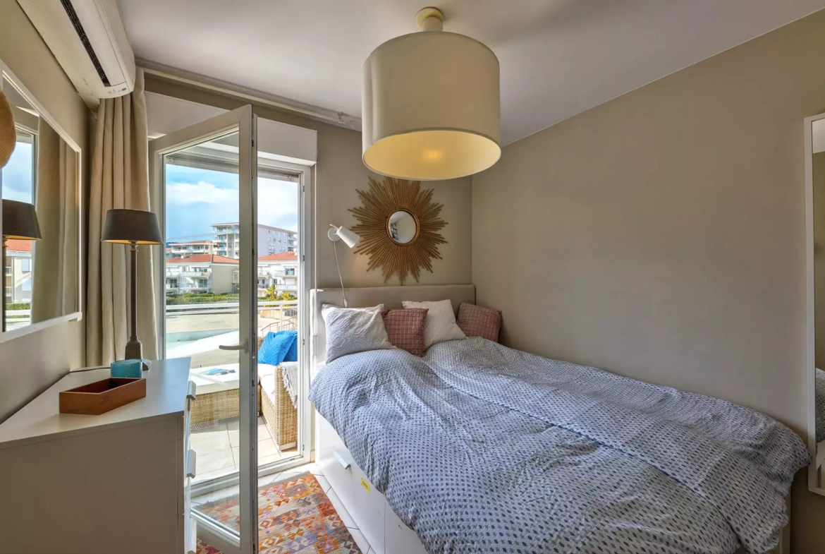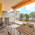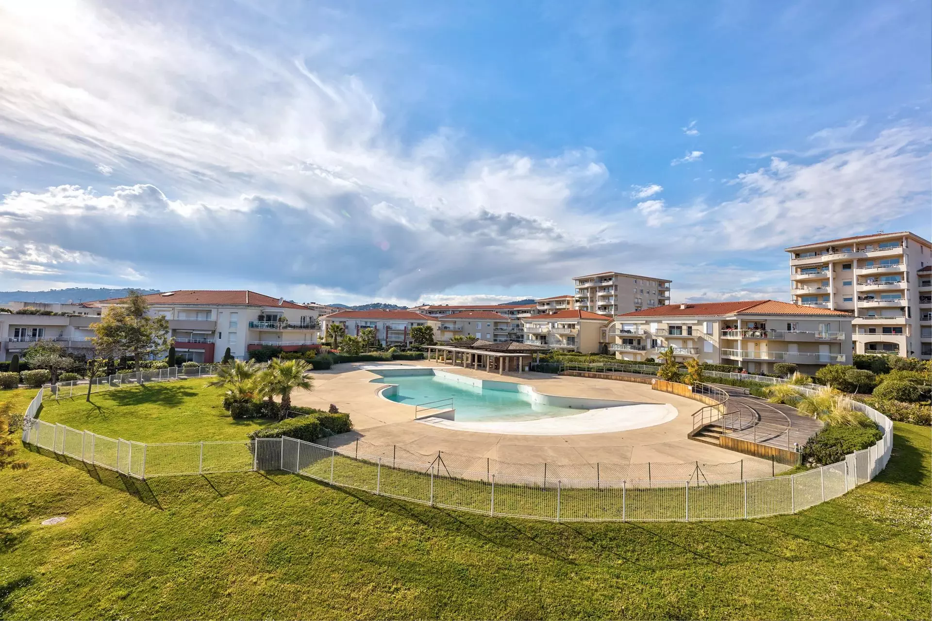 Juan-les-Pins’ssä, kivenheiton matkan päässä hiekkarannasta sijaitseva asunto, jonka terassilta näkymä uima-altaalle.