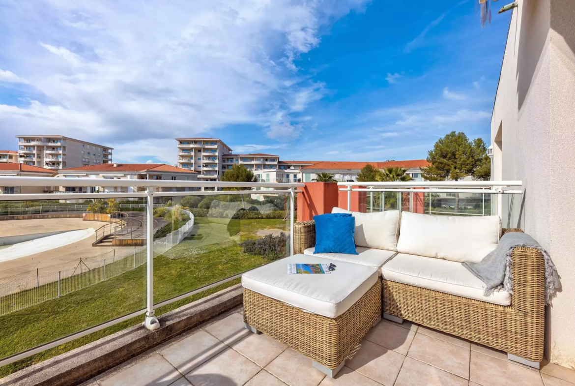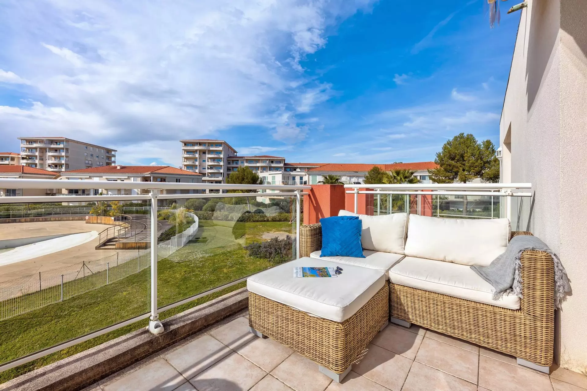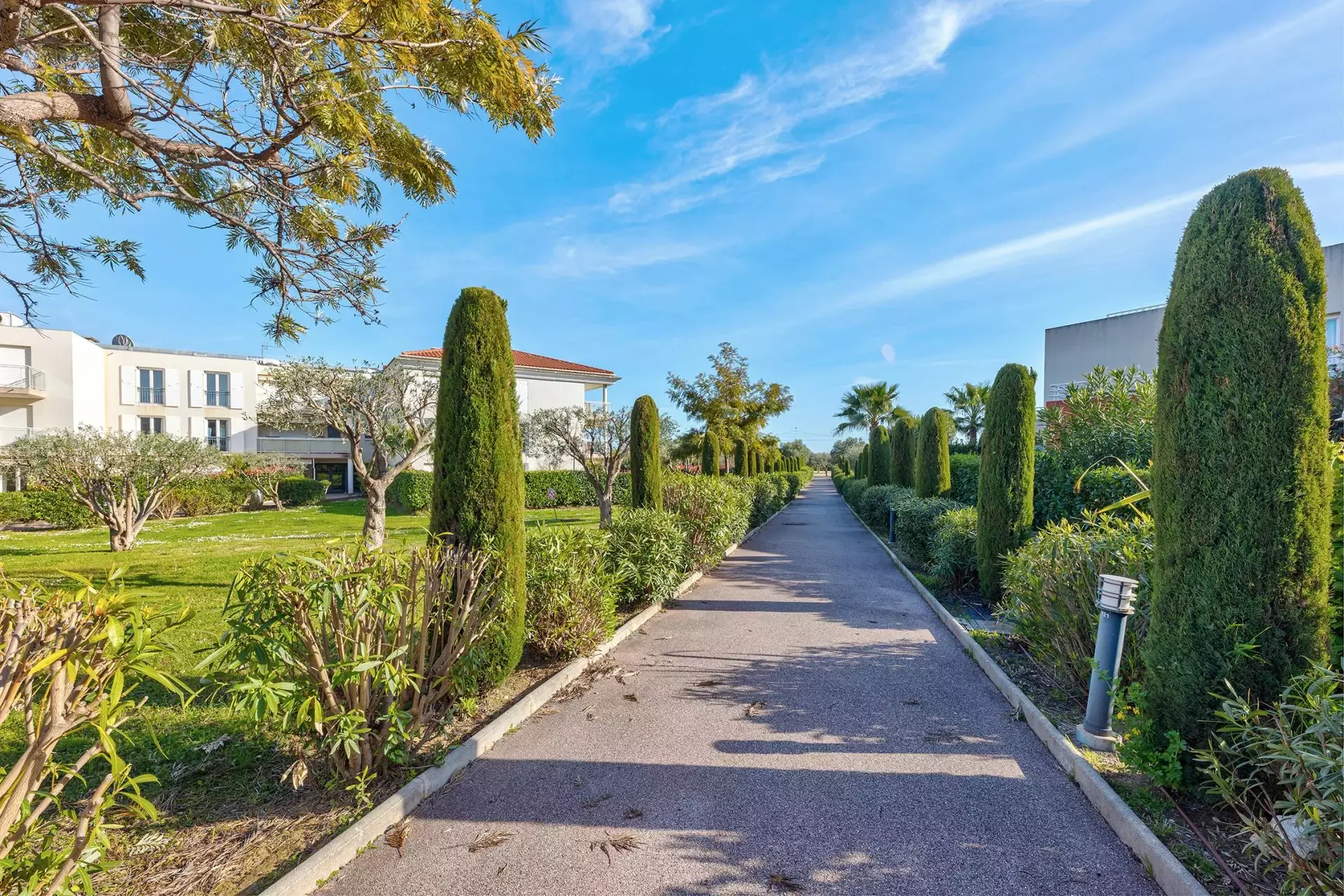 Asunnolta on 200 metrin matka rannalle ja monet peruspalvelut sijaitsevat lyhyen kävelymatkan päässä. Juan-les-Pinsin keskustaan on n. 1,5 km. Bussit kulkevat läheltä.