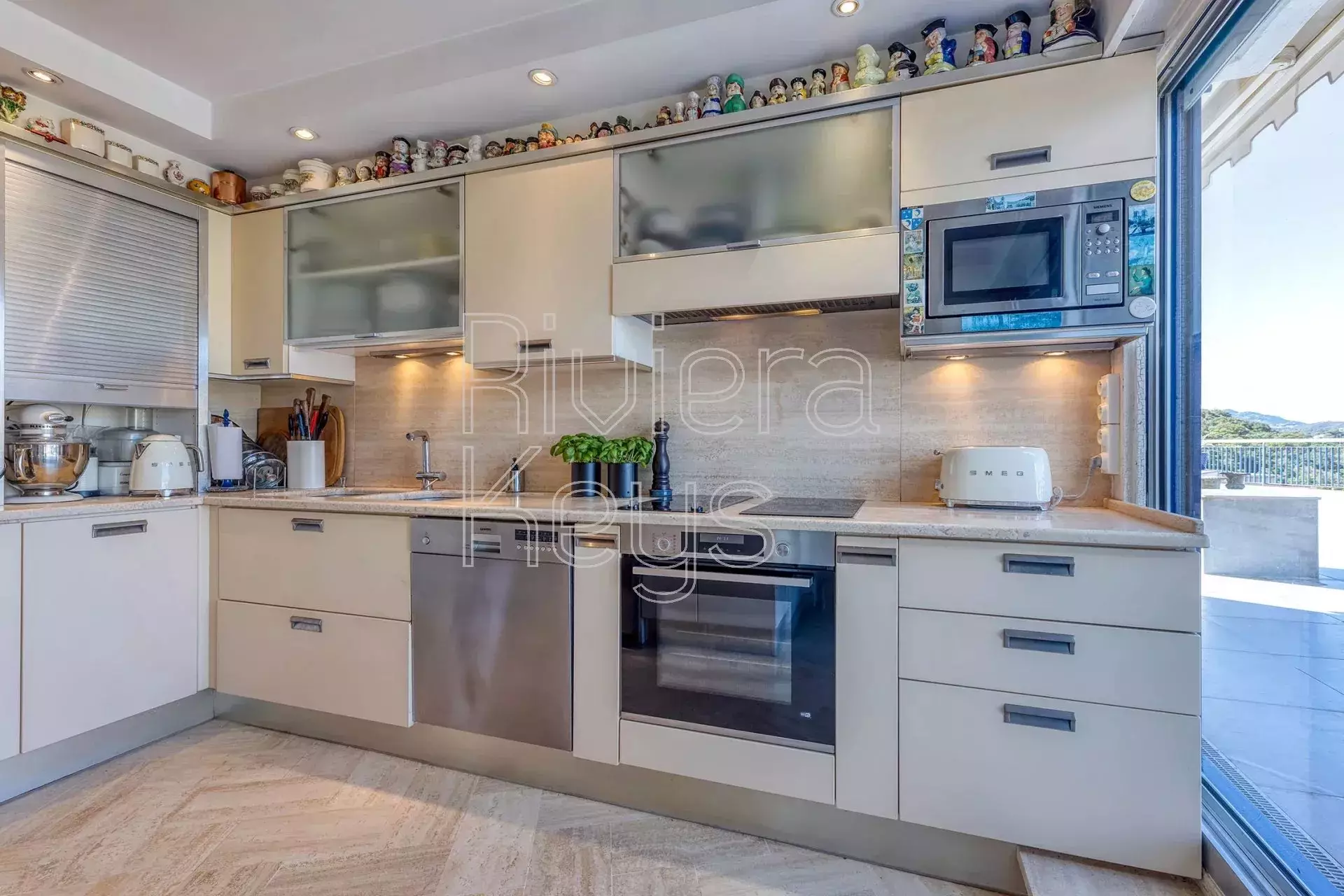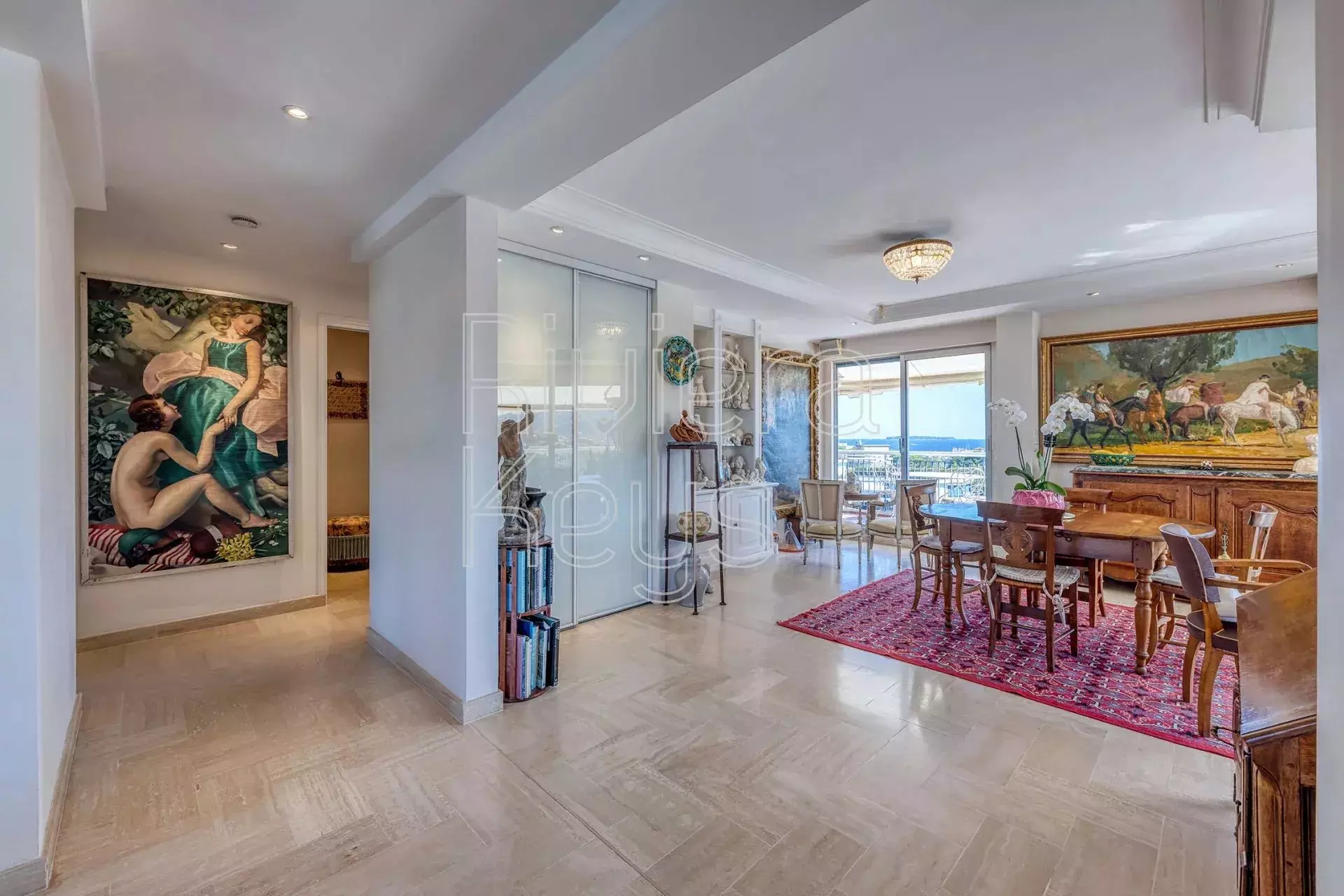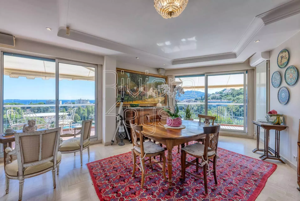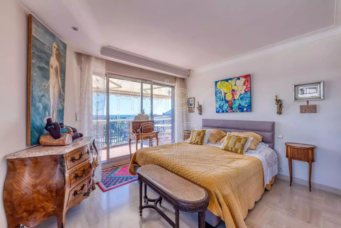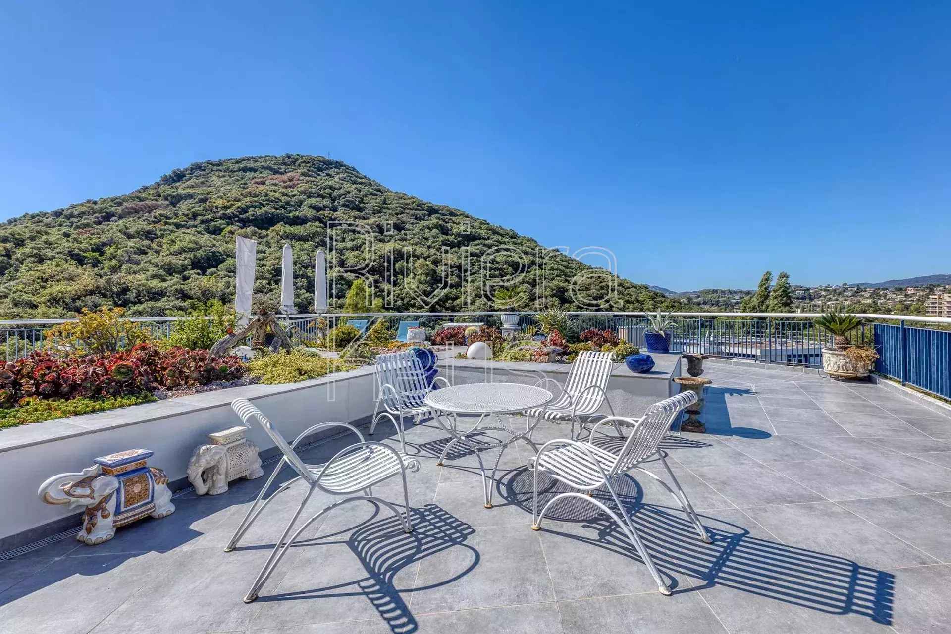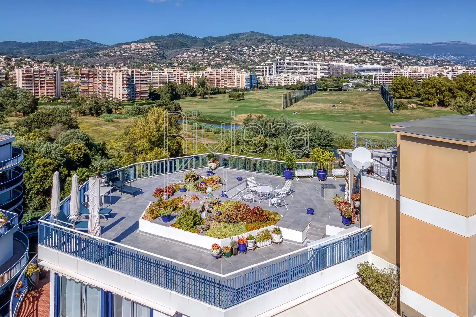 Mandelieu-la-Napoulessa sijaitseva, ylimmän kerroksen asunto, jolla suuri terassi ja panoraamanäkymät merelle.