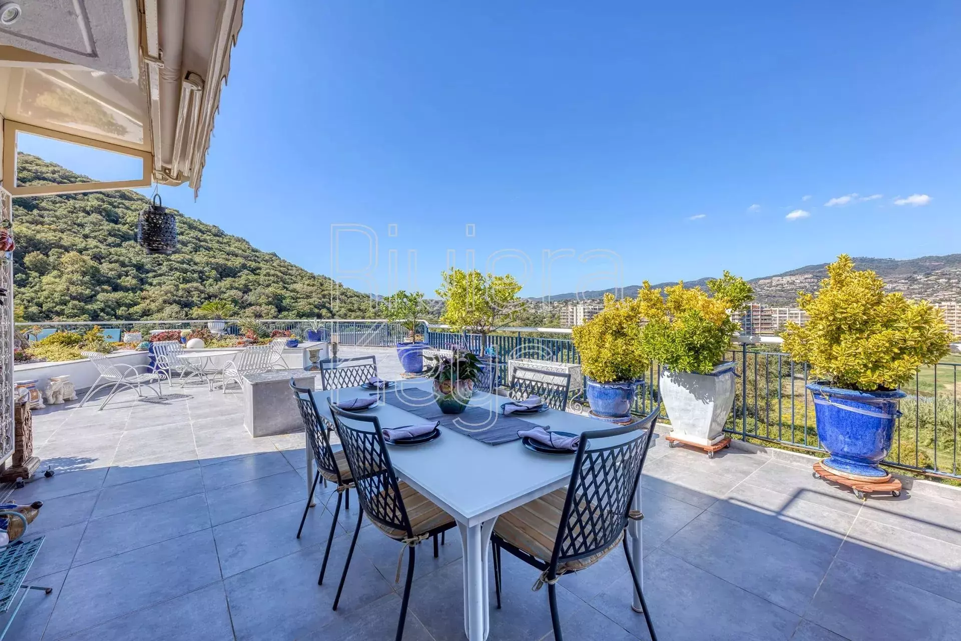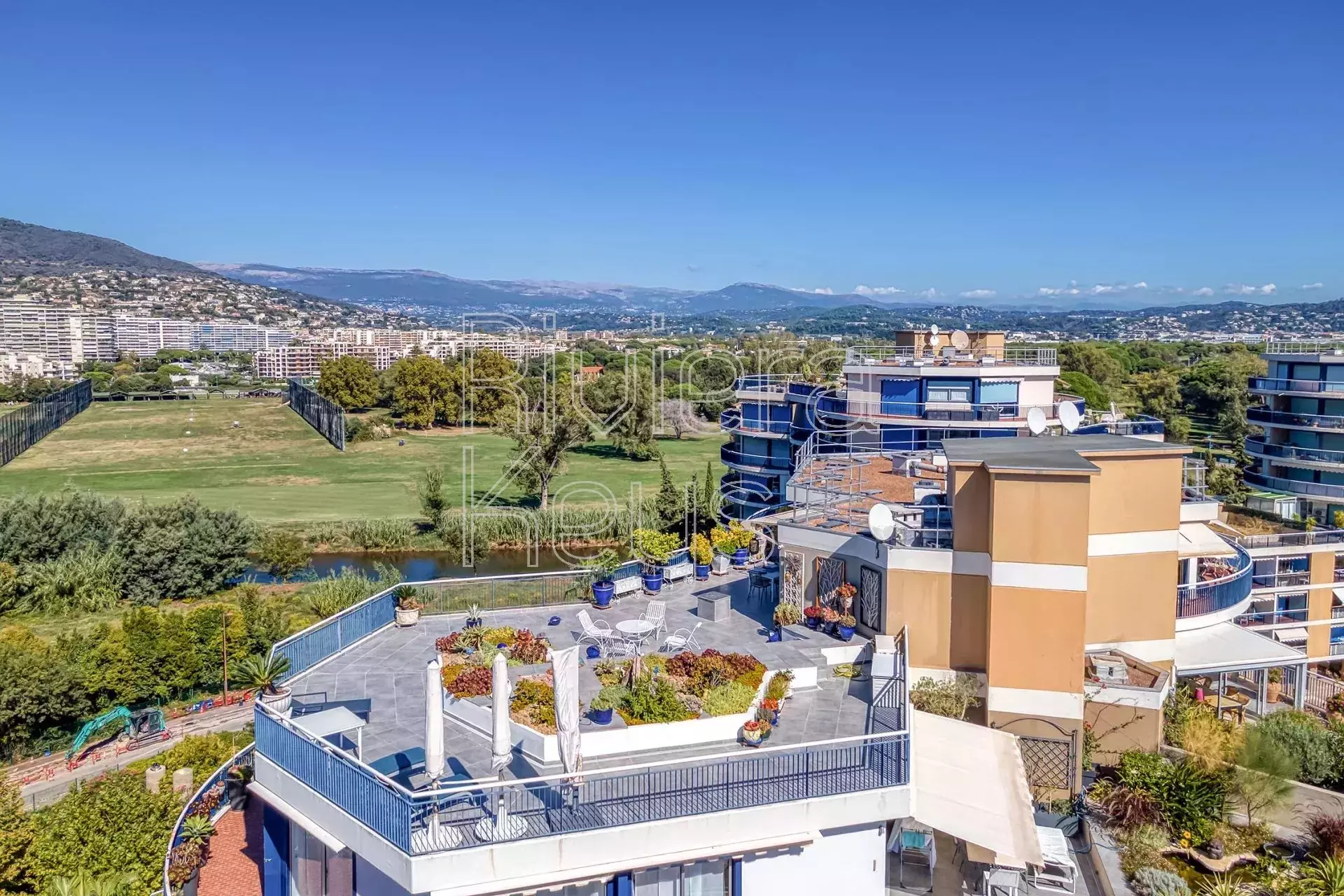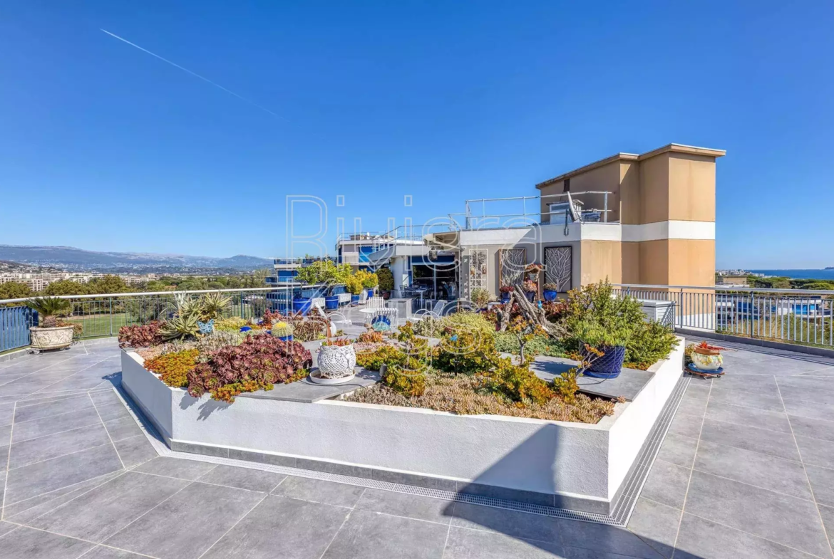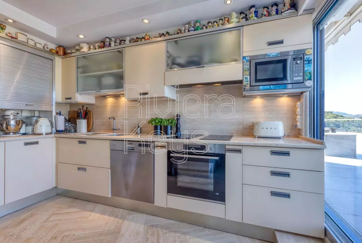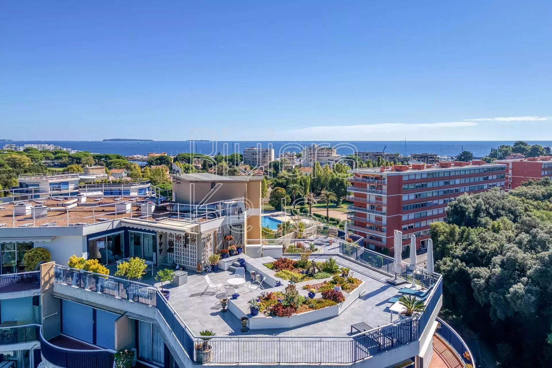 Mandelieu-la-Napoulessa sijaitseva, ylimmän kerroksen asunto, jolla suuri terassi ja panoraamanäkymät merelle.