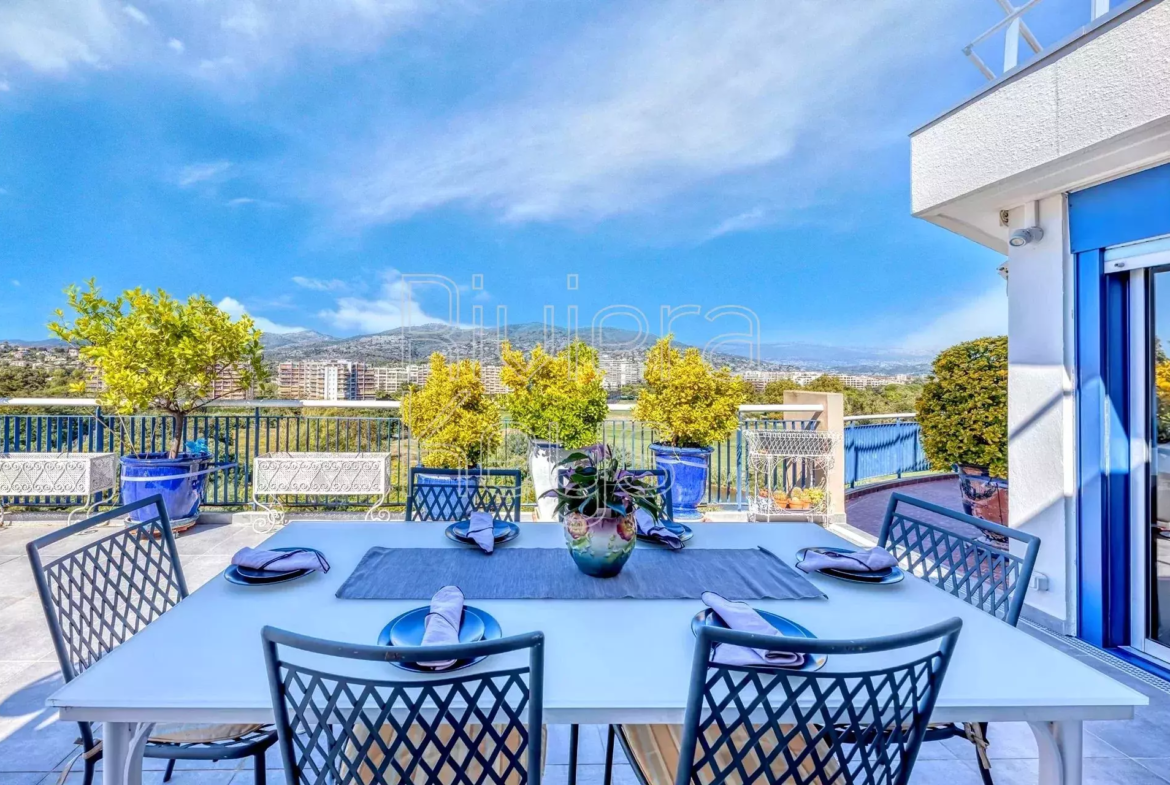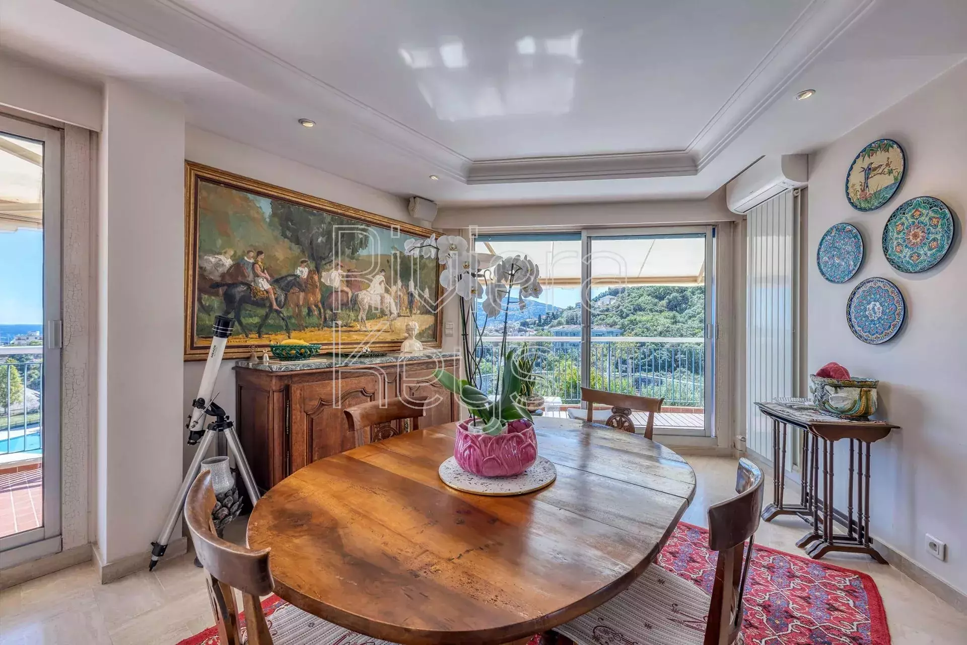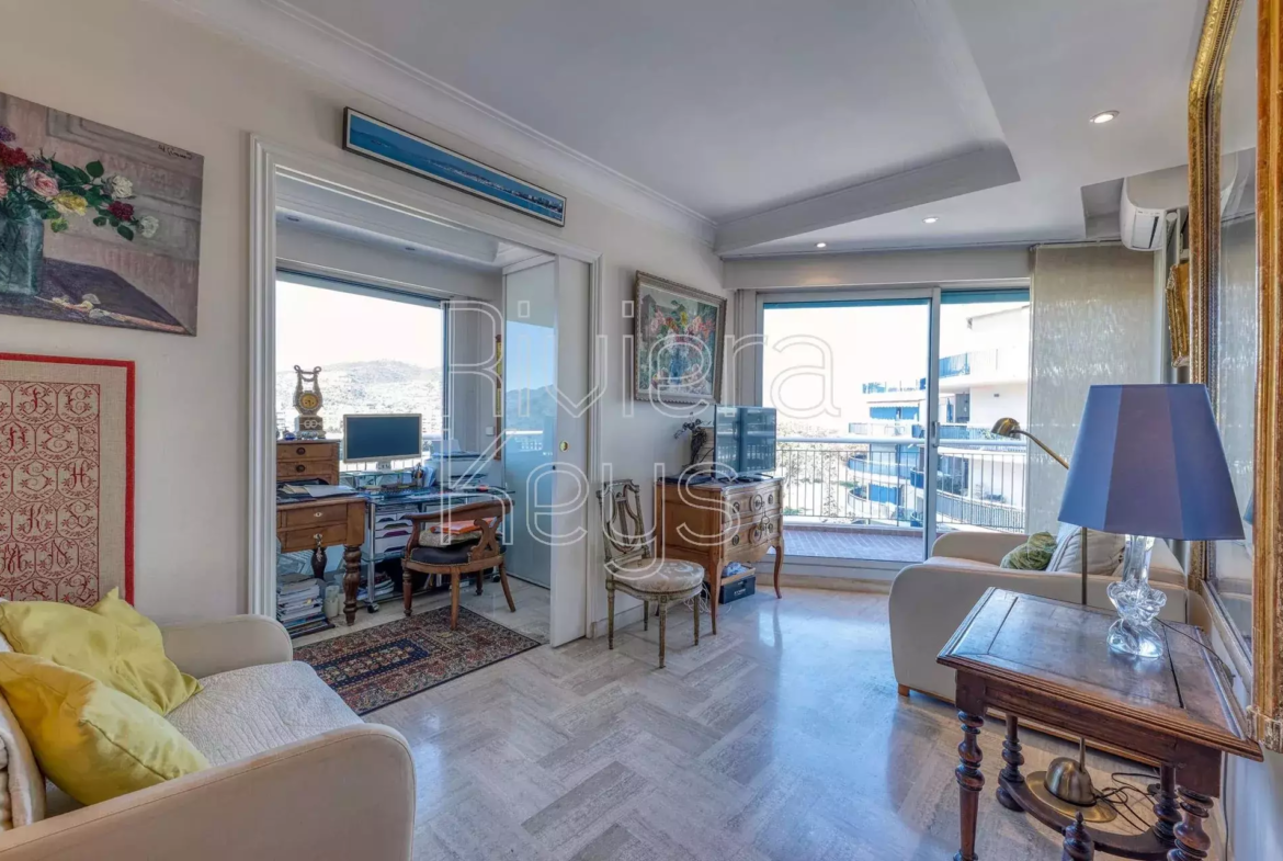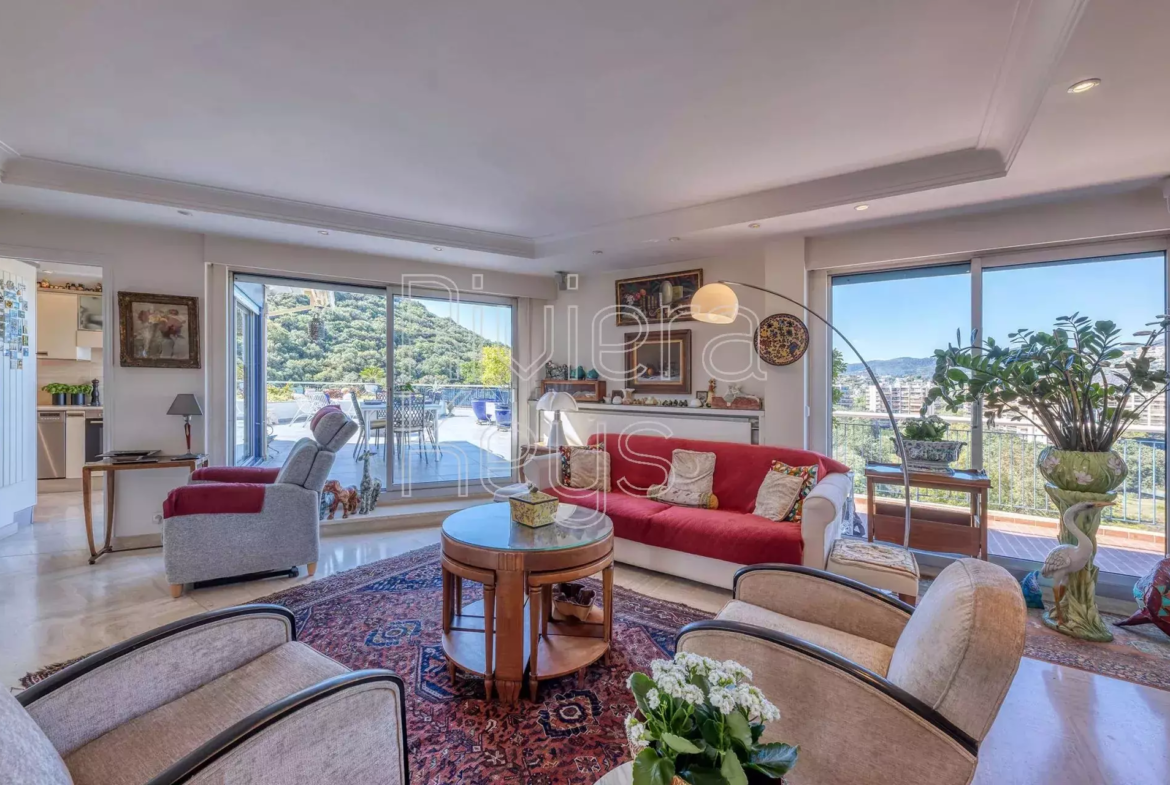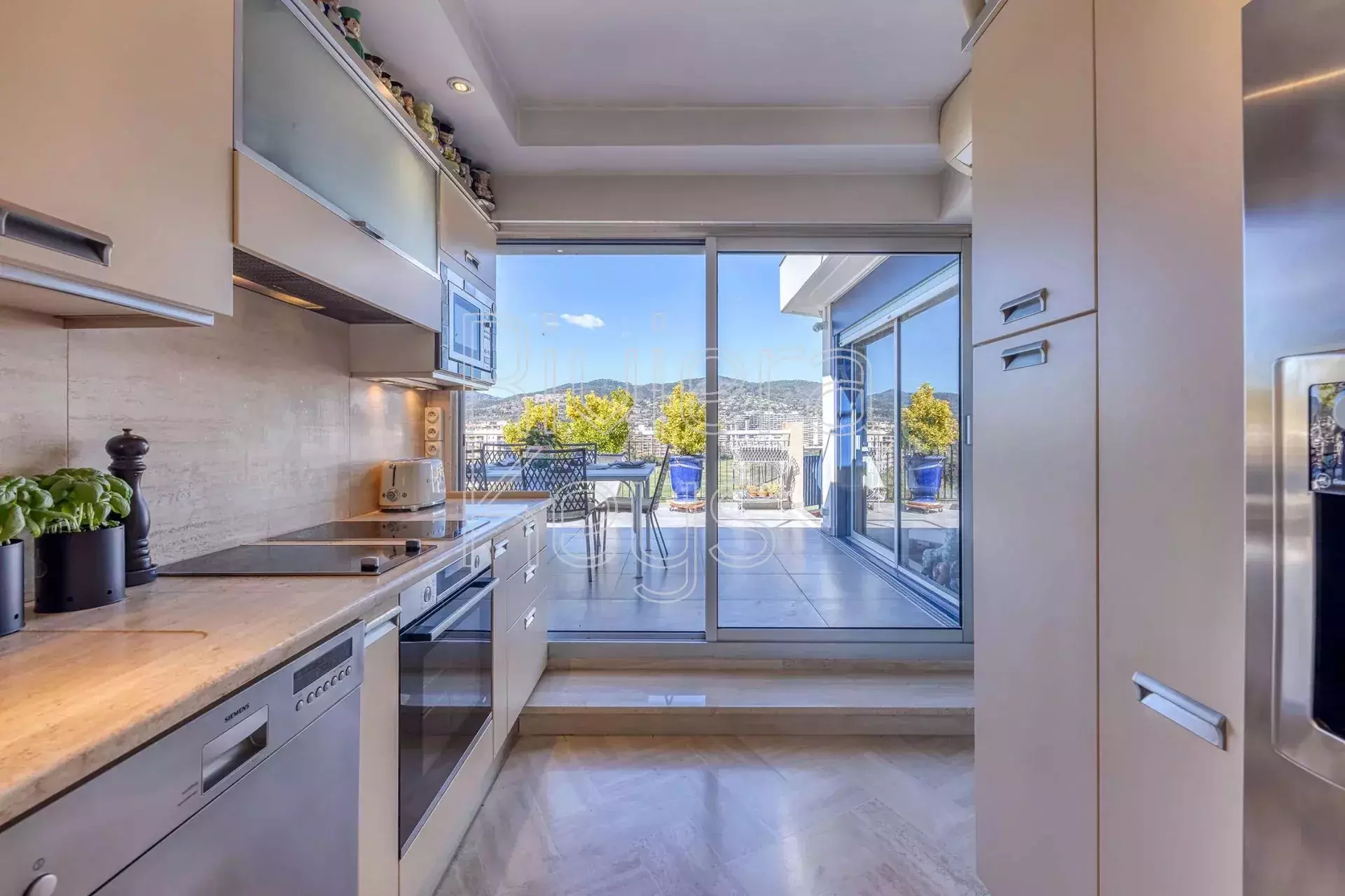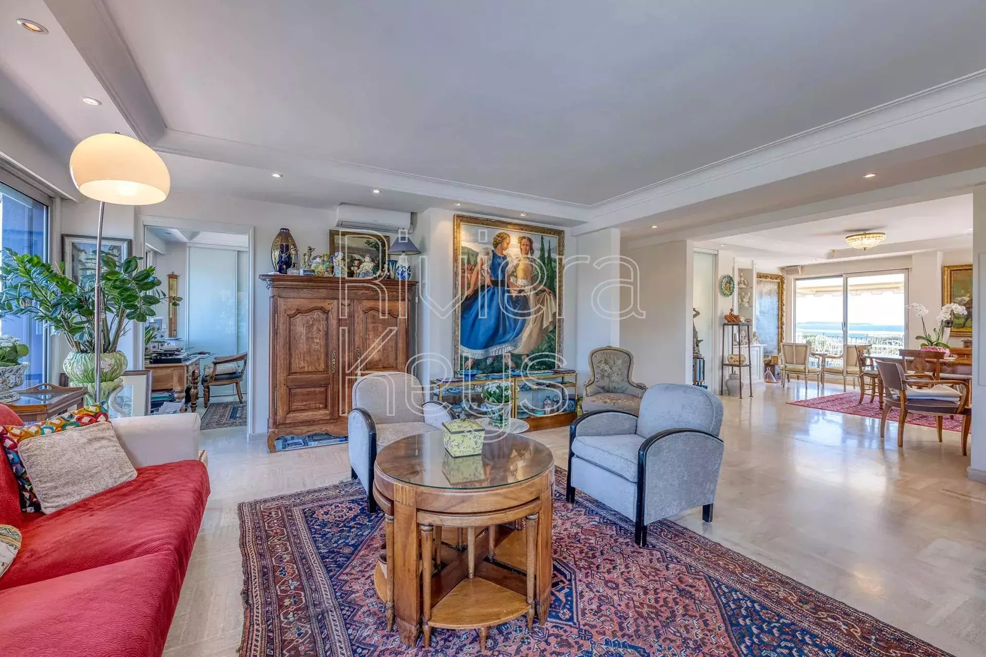 Mandelieu-la-Napoulessa sijaitseva, ylimmän kerroksen asunto, jolla suuri terassi ja panoraamanäkymät merelle.