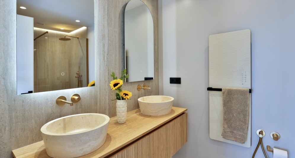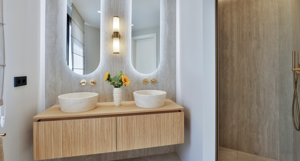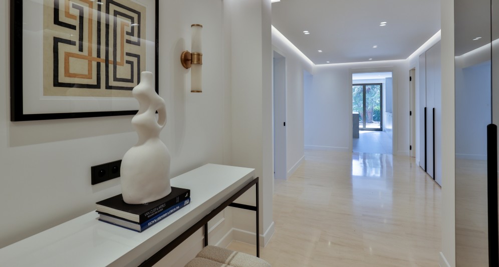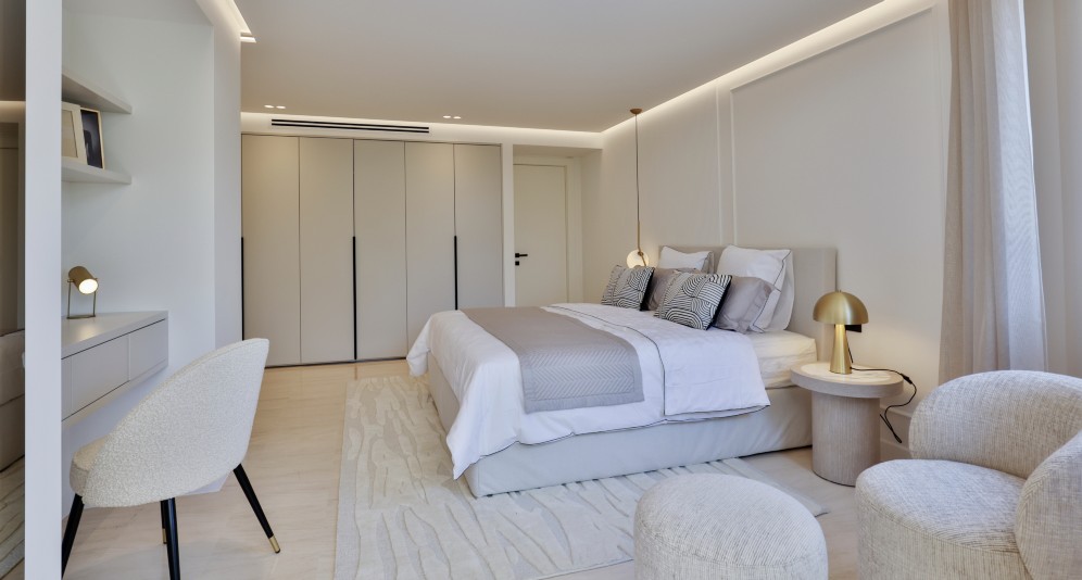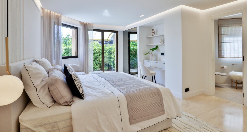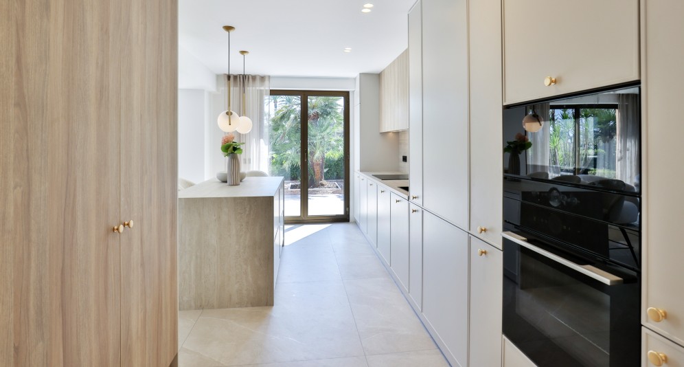 Asunnossa on olohuone, puoliavoin keittiö ja kolme makuuhuonetta, joista jokaisella on oma kylpyhuone ja wc. Kaikista huoneista on käynti asuntoa ympäröivälle terassille ja yksityiseen puutarhaan, josta pääsee taloyhtiön uima-altaalle. Mahdollista ostaa erikseen kellarivarasto ja autotalli kahdelle autolle.