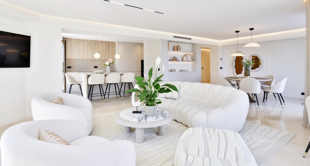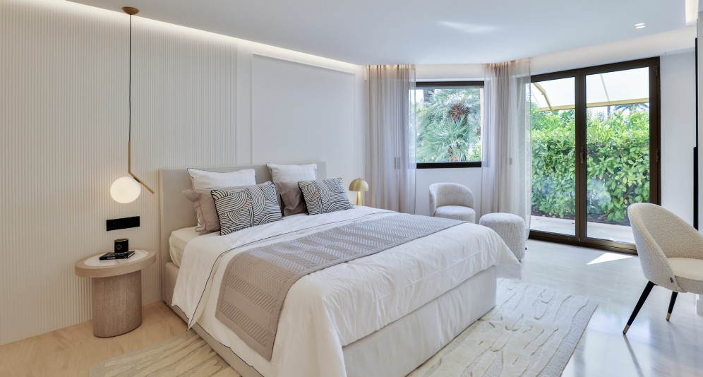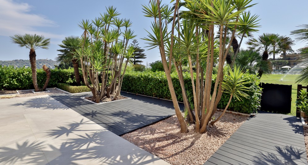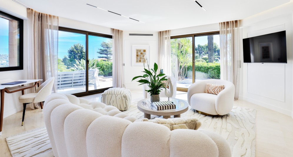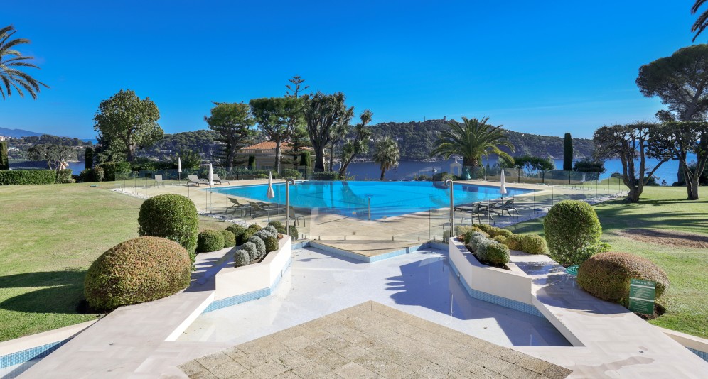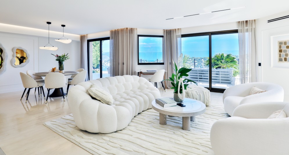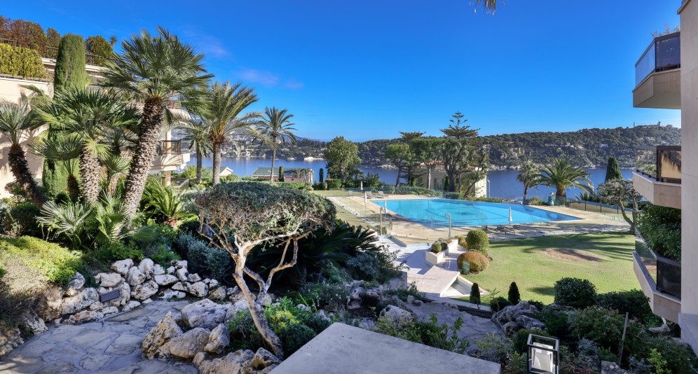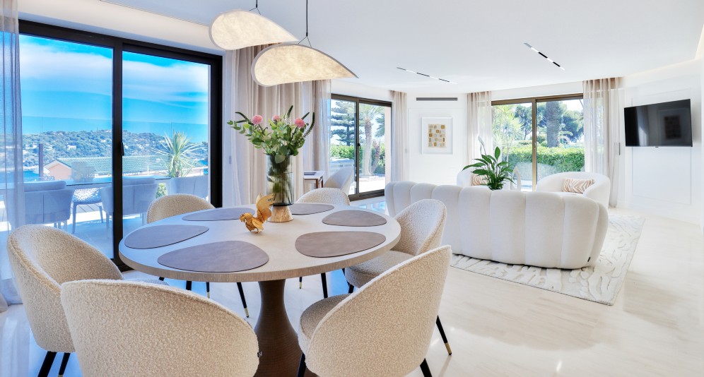 Nizzan niemen erittäin arvostetulla alueella, korkeatasoisessa taloyhtiössä sijaitseva, täysin remontoitu  asunto, jolla kaunis puutarha ja huikea merinäkymä.