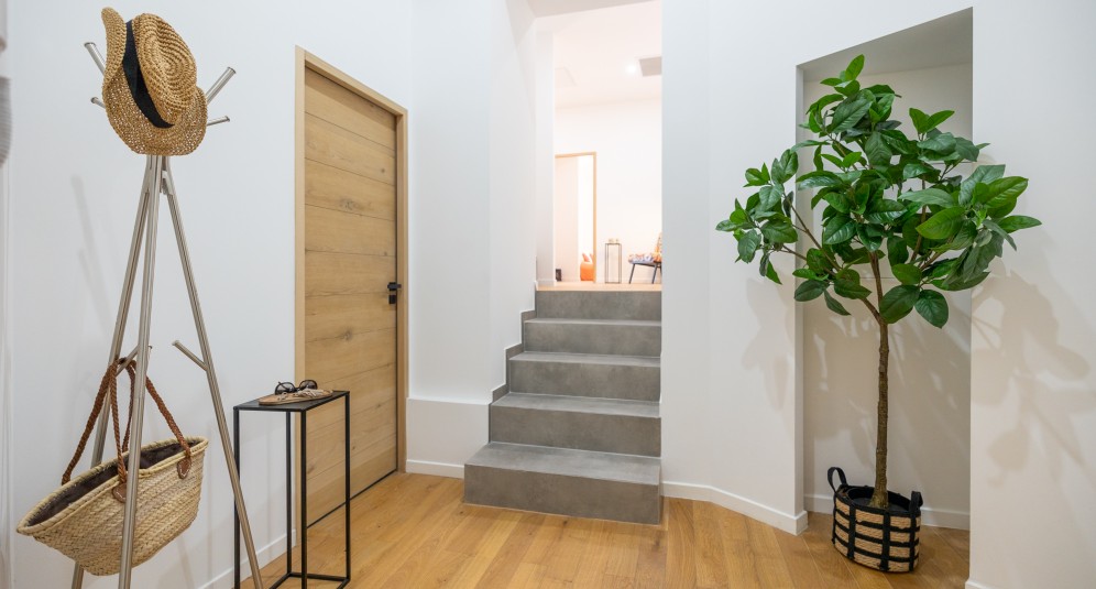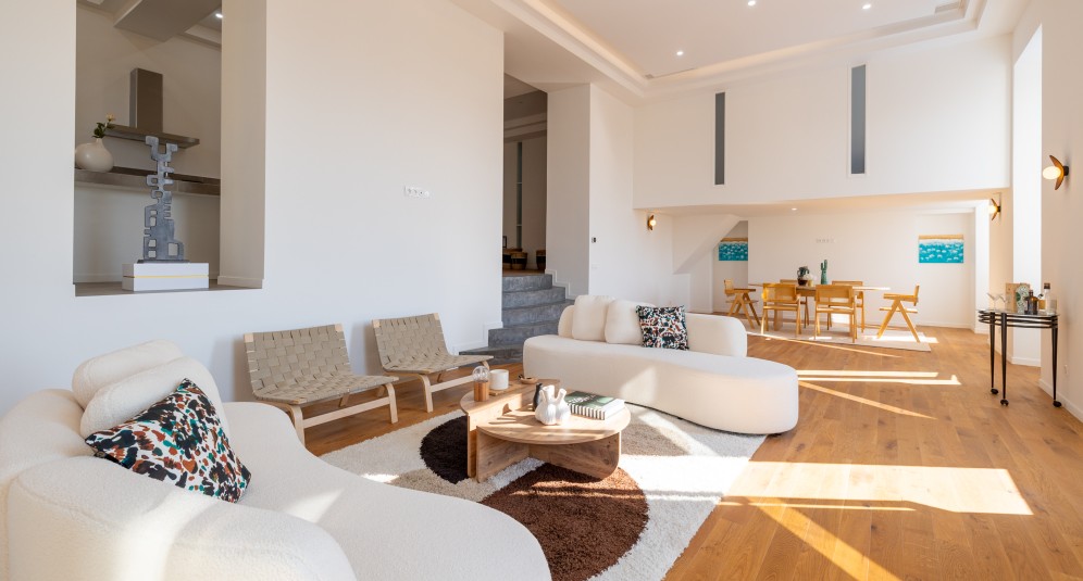 Asunnossa on eteinen, suuri olohuone, avokeittiö, kolme makuuhuonetta omilla vaatehuoneillaan, kaksi kylpyhuonetta ja kaksi erillistä wc:tä. Korkeakattoisesta olohuoneesta on käynti 26 m2:n aurinkoiselle terassille. Asunto sijaitsee 1. kerroksessa, suomalaisittain 2. kerros eikä talossa ole hissiä.
