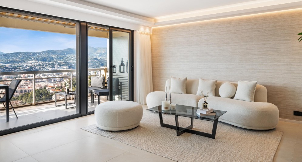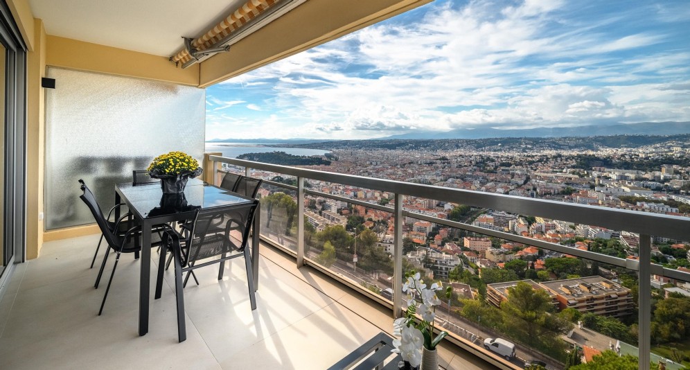 Nizzan Mont-Boronilla, lähellä Col-de-Villefranchen palveluita ja metsäisiä ulkoilumaastoja sijaitseva ylimmän kerroksen remontoitu asunto, jolta panoraamanäkymät kaupungille, kukkuloille ja merelle.
