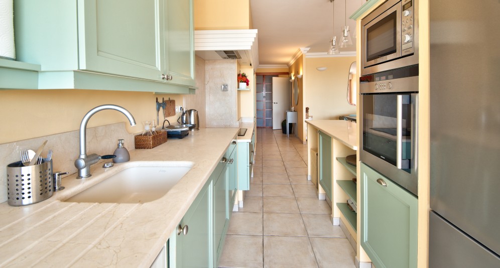 Asunnossa on eteinen, olohuone avokeittiöllä, kaksi makuuhuonetta sekä kaksi kylpyhuonetta, joista toisessa on wc. Olohuoneesta on käynti etelään suuntautuvalle 10 m2:n terassille. Asuntoon kuuluu autotalli sekä kellarivarasto.