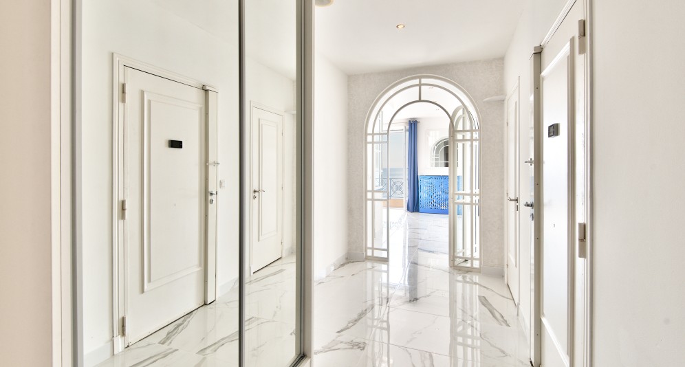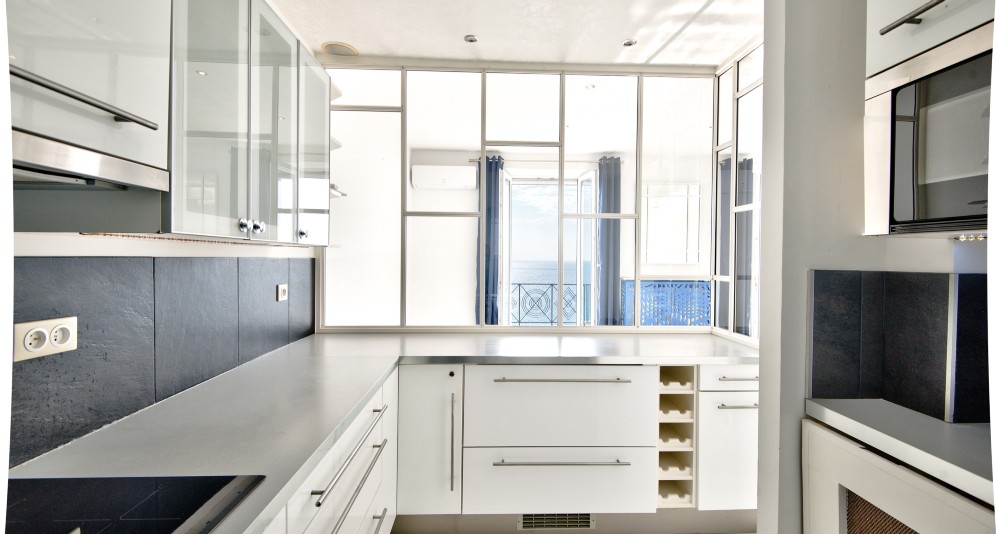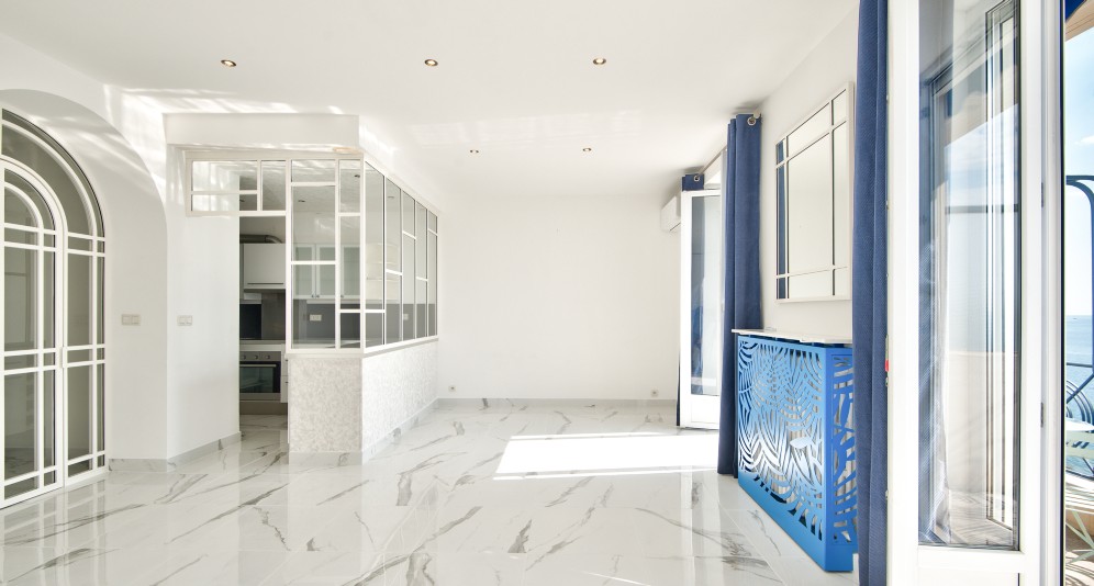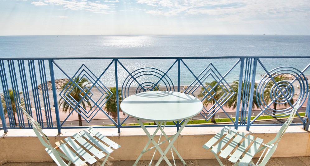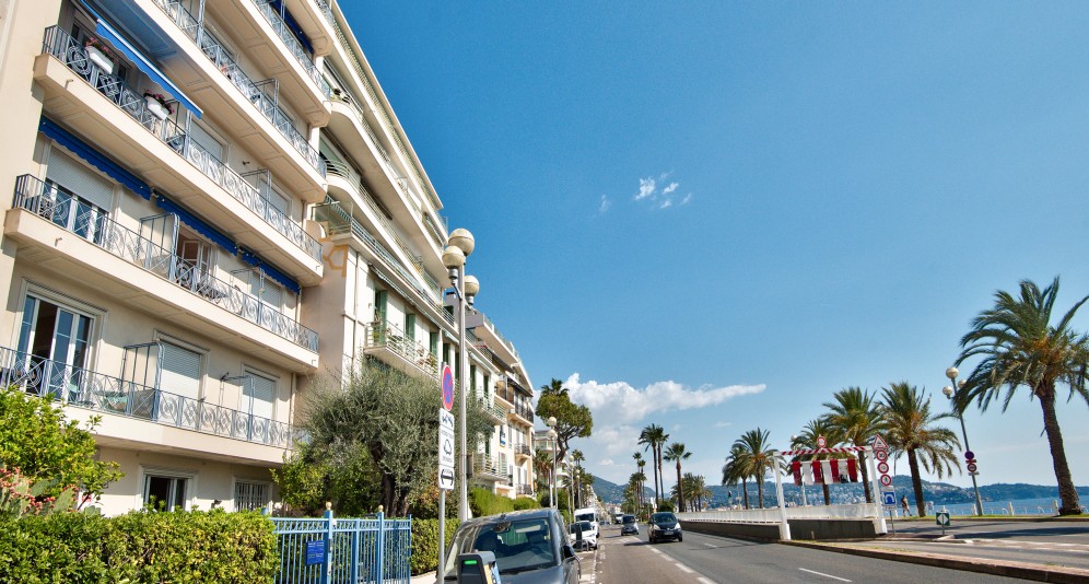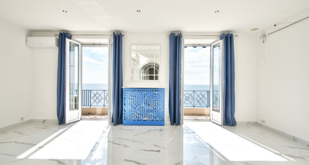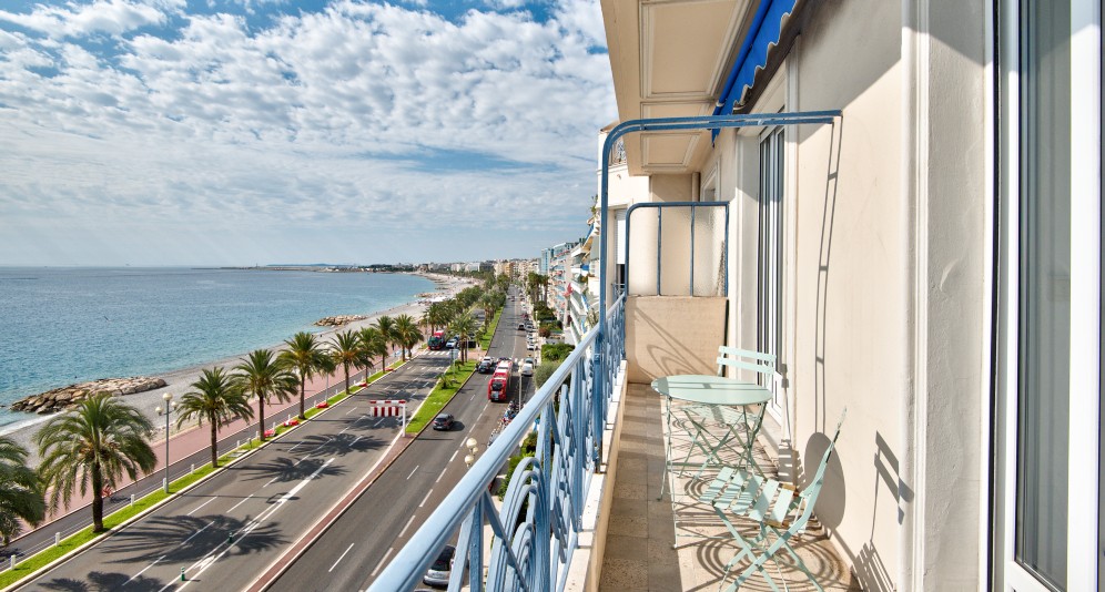 Nizzan Promenade des Anglais -rantakadulla sijaitseva, toiseksi ylimmän kerroksen asunto, jolta upeat panoraamanäkymät merelle.