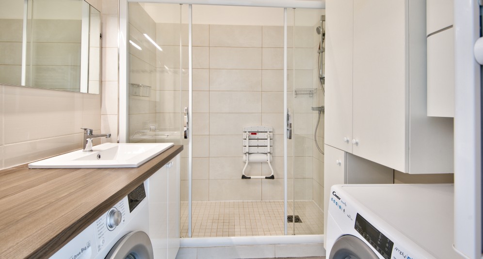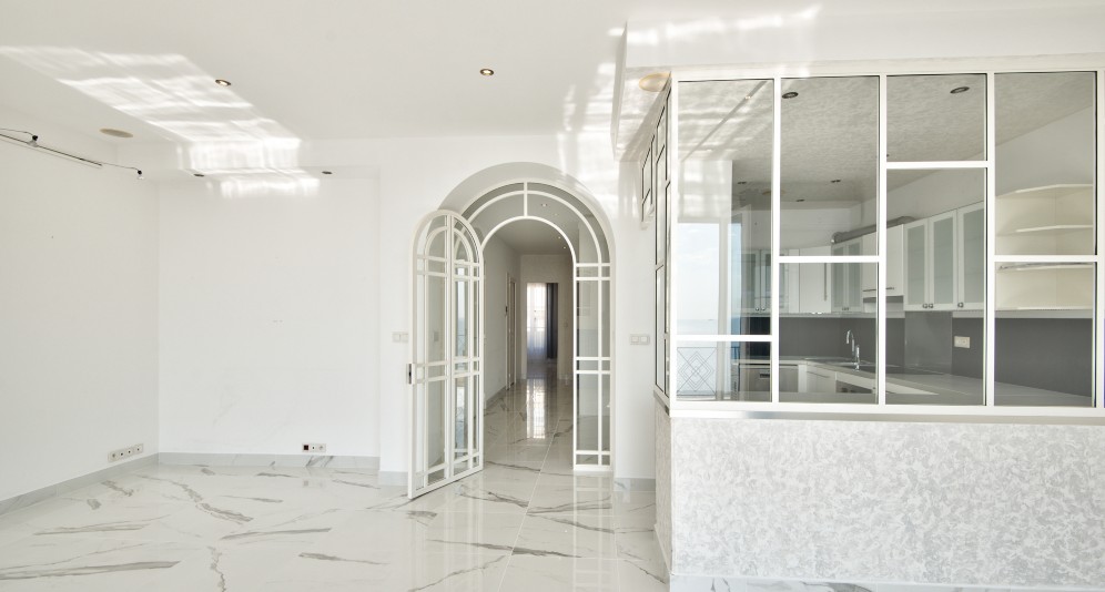 Asunnossa on eteinen, valoisa olohuone, puoliavoin keittiö, kaksi makuuhuonetta, kaksi kylpyhuonetta sekä erillinen wc. Olohuoneen kaksi suurta lasiovea vievät merenpuoleiselle parvekkeelle etelään. Makuuhuoneista on käynti pohjoispuolen parvekkeelle. Asuntoon kuuluu kellarivarasto.