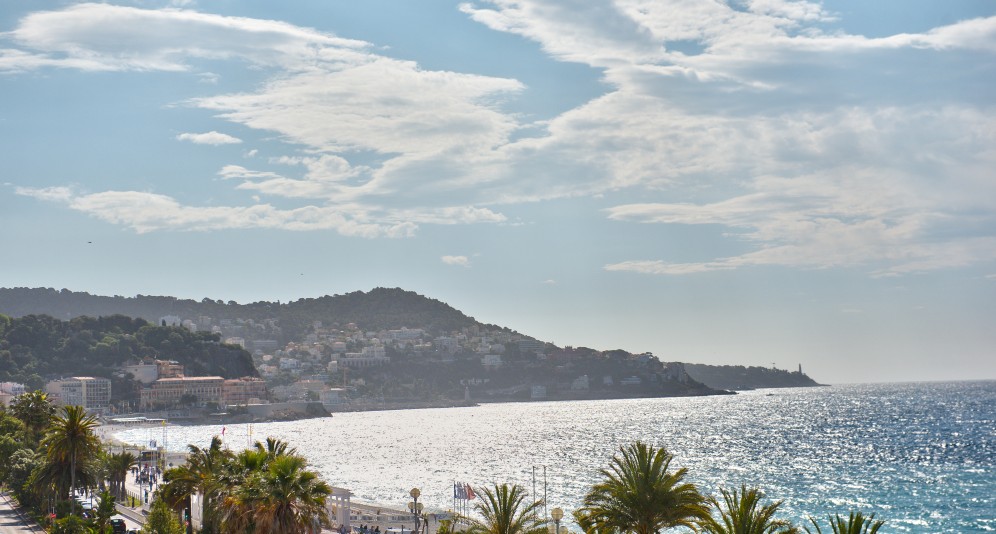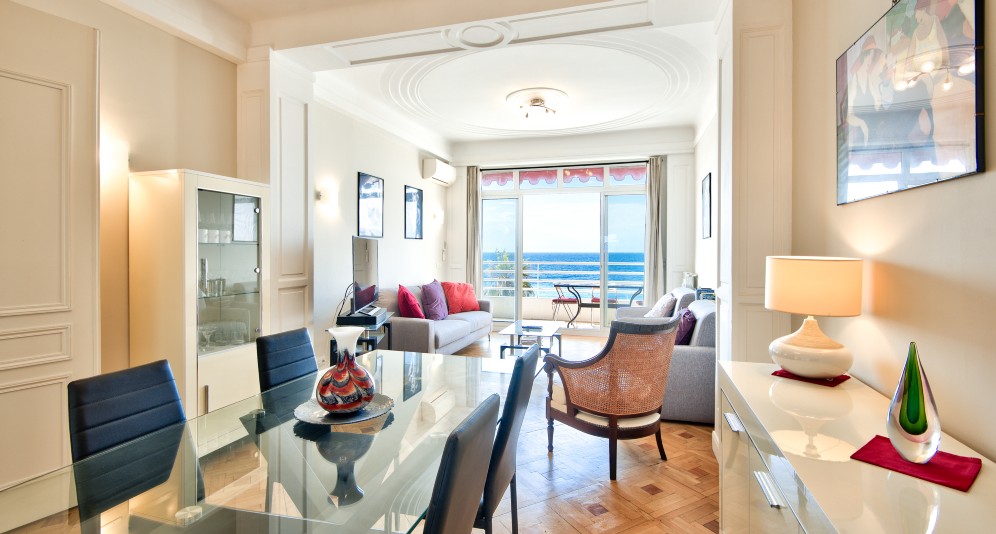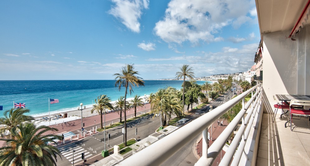 Nizzan Promenade des Anglais’n parhaalla osiolla, Palais de la Méditerranéen ja hotelli Negrescon välissä sijaitseva, erinomaisessa kunnossa oleva läpitalon asunto, jolta aukeaa postikorttimaisemat merelle.