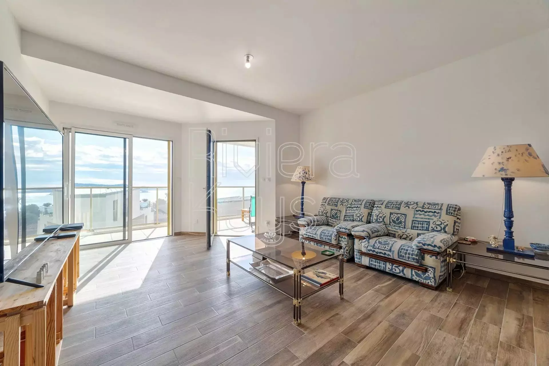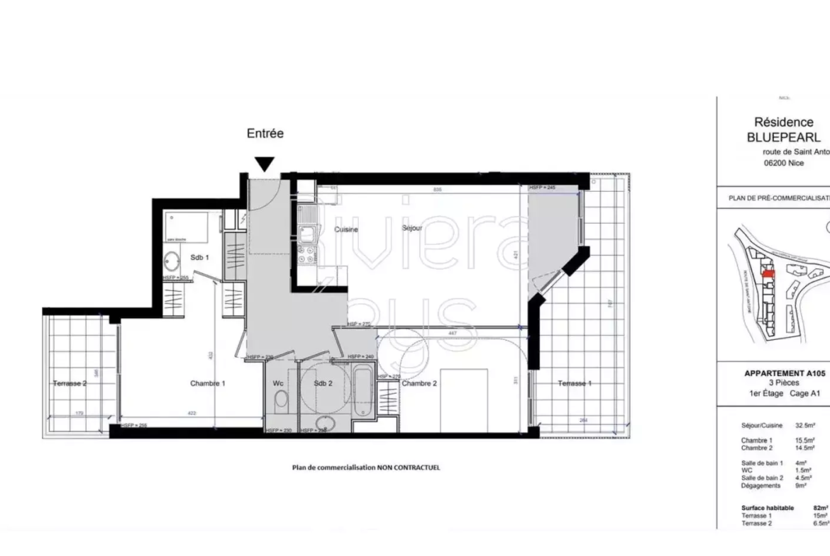 Asunnossa on eteinen, valoisa olohuone avokeittiöllä, kaksi makuuhuonetta, kaksi kylpyhuonetta sekä erillinen wc. Olohuoneesta ja toisesta makuuhuoneesta on käynti itään suuntautuvalle n. 10 m2:n terassille, jolta aukeaa panoraamanäkymät merelle ja vuorille. Toisesta makuuhuoneesta on käynti n. 5 m2:n terassille länteen. Asuntoon kuuluu parkkipaikka parkkihallista.