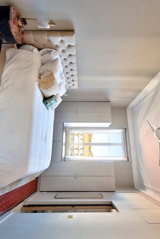 Asunnossa on tilava eteinen, valoisa olohuone avokeittiöllä, kaksi makuuhuonetta sekä kaksi kylpyhuonetta, jossa molemmissa wc:t. Olohuoneesta on käynti parvekkeelle, joka suuntautuu etelään. Paljon kauniita yksityiskohtia, kuten korkeat huoneet, kaksi takkaa ja provencelaista terrakottalattiaa. Asunto sijaitsee talon 4. kerroksessa (suomalaisittain 5. krs). Talossa ei ole hissiä. Asuntoon kuuluu kellarivarasto.