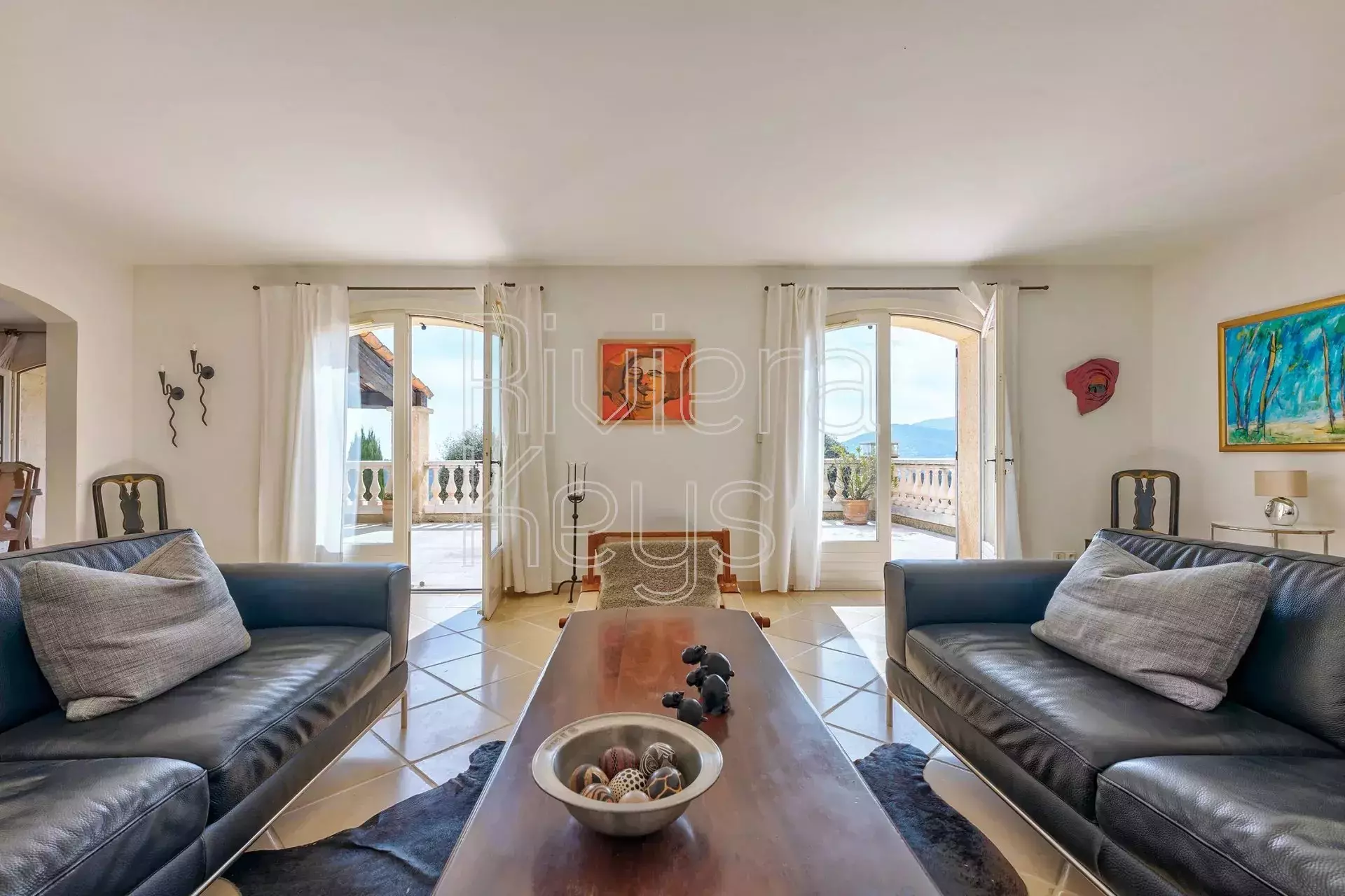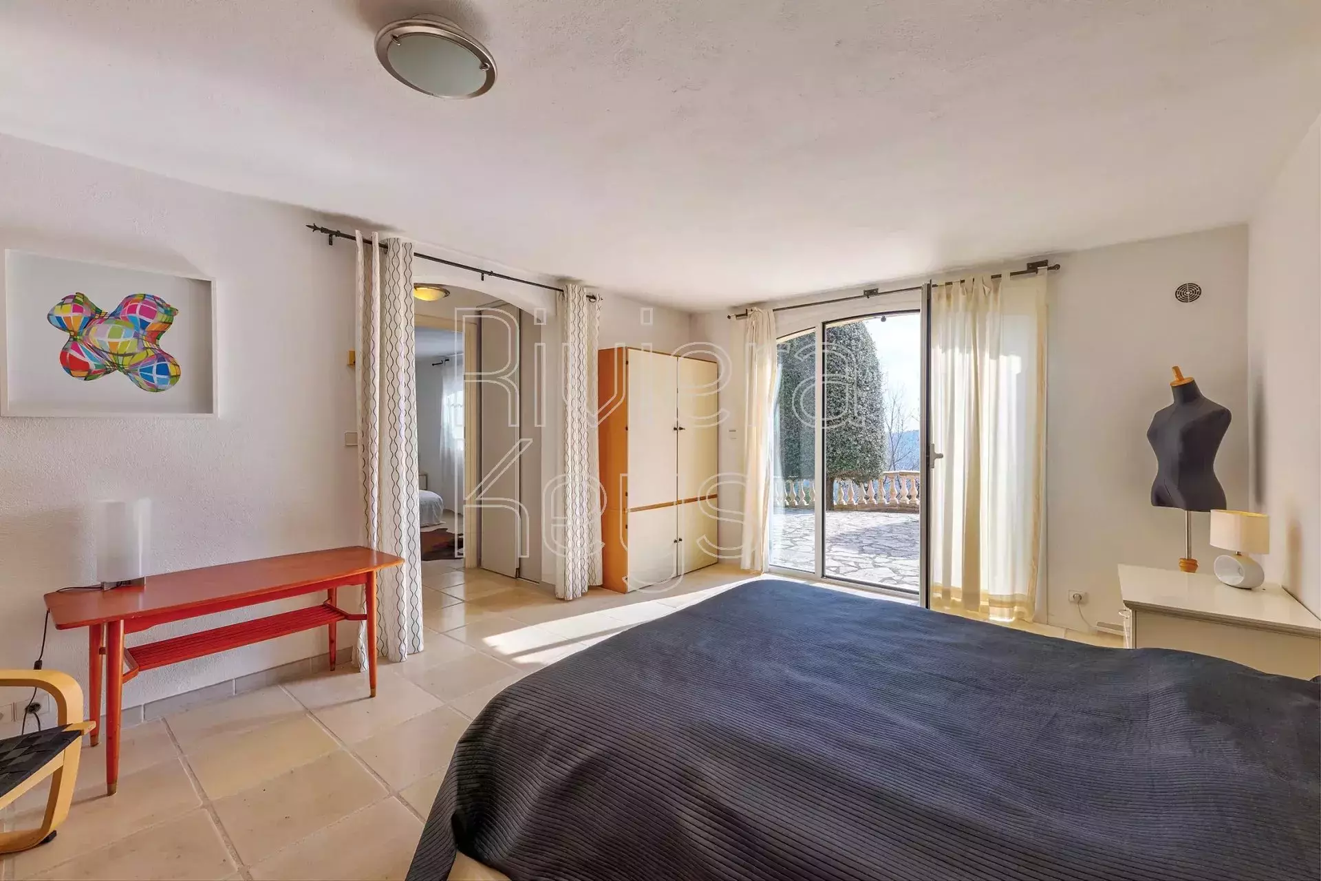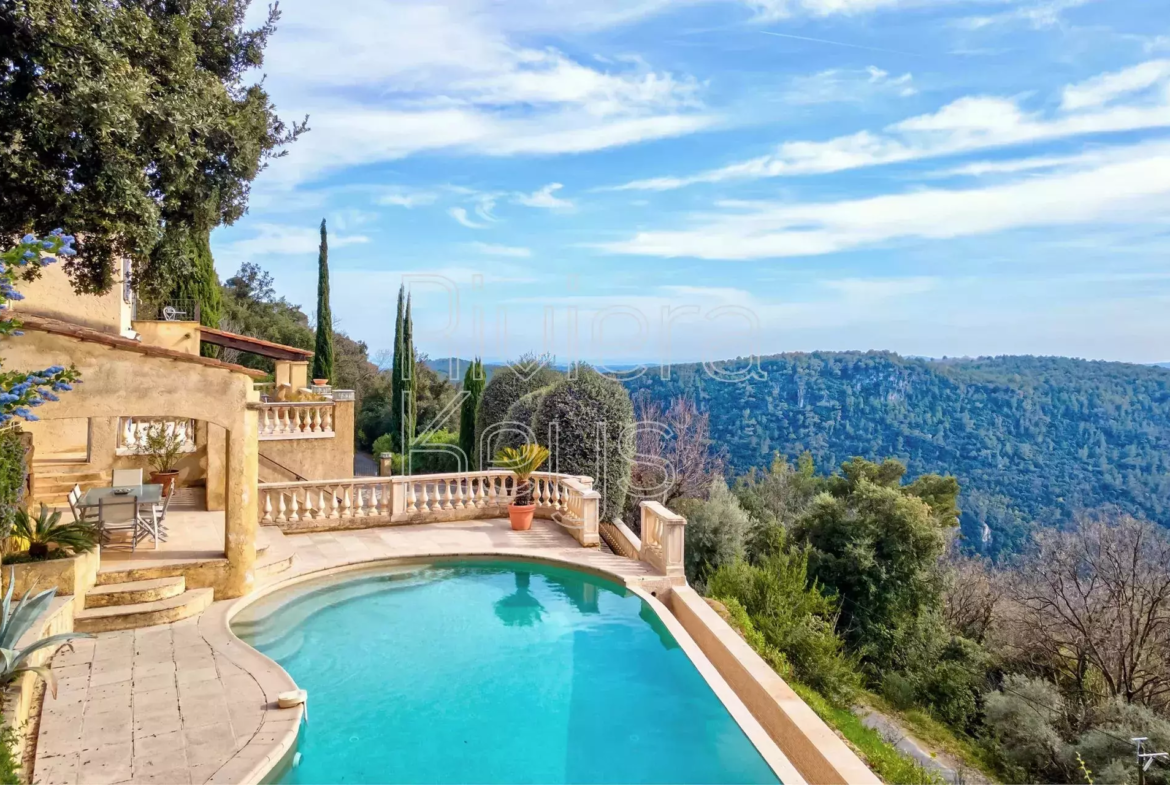 Tourrettes-sur-Loup’ssa, lyhyen ajomatkan päässä viehättävän, keskiaikaisen kylän palveluista sijaitseva talo, jolta aukeaa panoraamanäkymät merelle saakka.