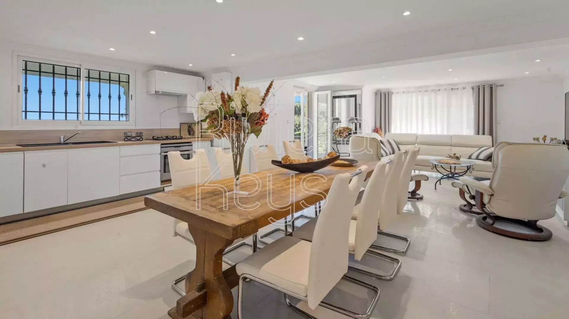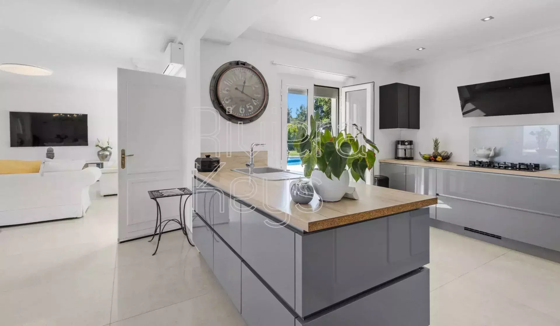 Pääasiassa yhdessä tasossa olevassa talossa on tilava olohuone, avokeittiö, ruokailutila ja neljä makuuhuonetta omilla kylpyhuoneillaan. Oleskelutiloista ja kahdesta makuuhuoneesta on käynti aurinkoiselle terassille, uima-altaalle ja pool-houselle. Olohuoneesta on käynti myös terassille, joka tarjoaa avoimet näkymät kukkuloille ja pilkahduksen merta.