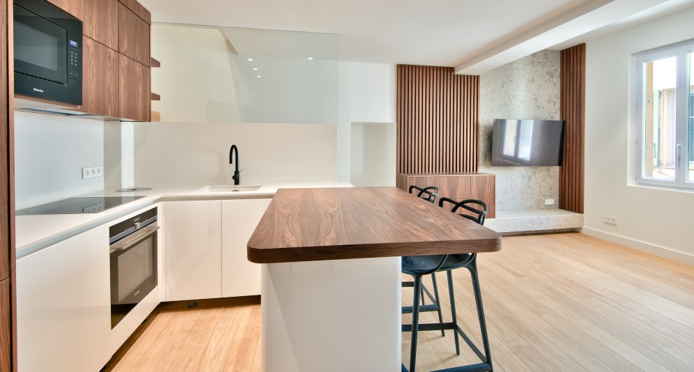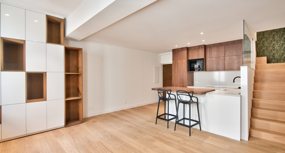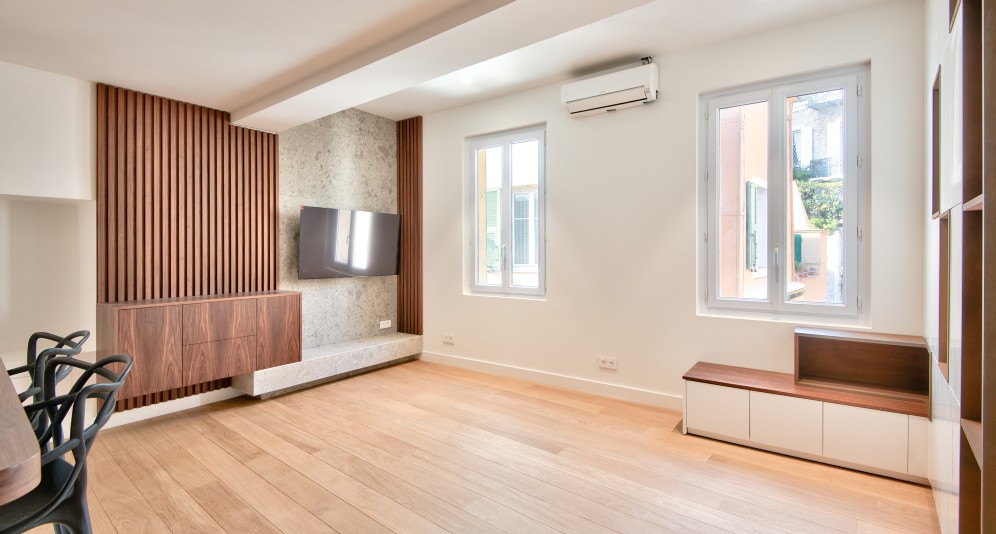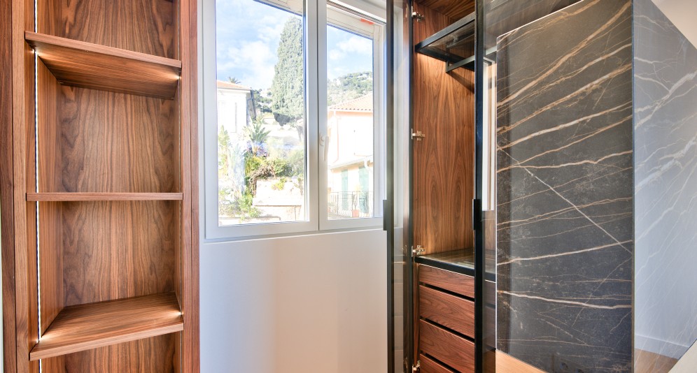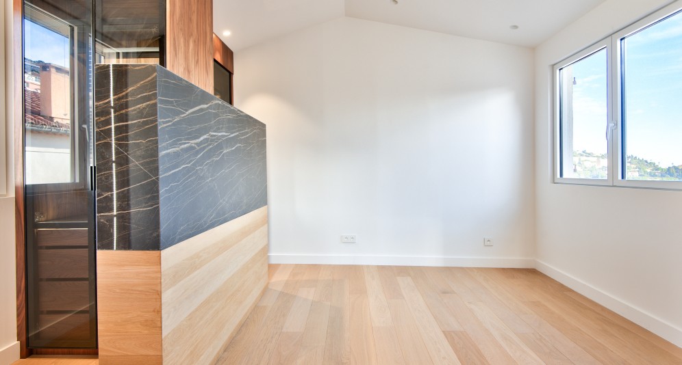 Asunnon alakerrassa on olohuone avokeittiöllä. Yläkerrassa on makuuhuone, kylpyhuone, wc ja vaatehuone. Yläkerrasta on postikorttimaisemat merelle ja Saint-Jean-Cap-Ferrat’lle.
