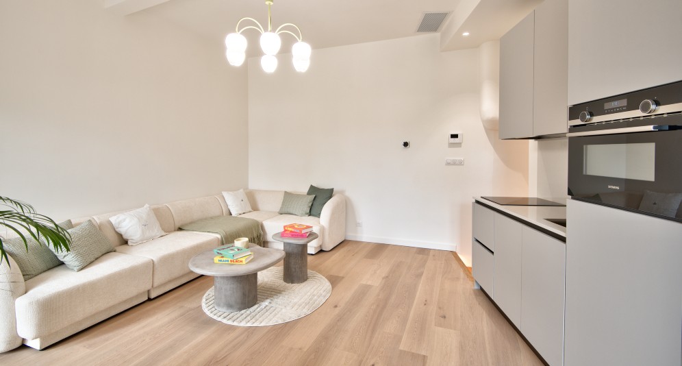 Asunnossa on valoisa olohuone, avokeittiö, kaksi makuuhuonetta, kaksi kylpyhuonetta, joissa molemmissa wc:t sekä vaatehuone. Oleskelutiloista on käynti etelään suuntautuvalle parvekkeelle. Asunnolla on oma sisäänkäyntinsä, jossa lisäksi kodinhoito- ja varastotilat.
