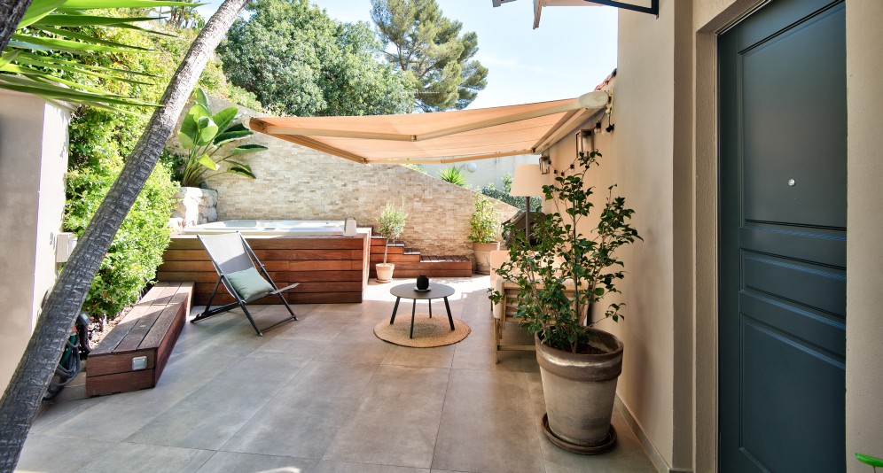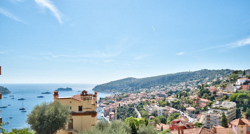 Villefranche-sur-Mer’n lahden poukamassa sijaitseva, remontoitu asunto omalla sisäänkäynnillä ja pihalla pienen huvilan ylimmässä kerroksessa merinäkymin.